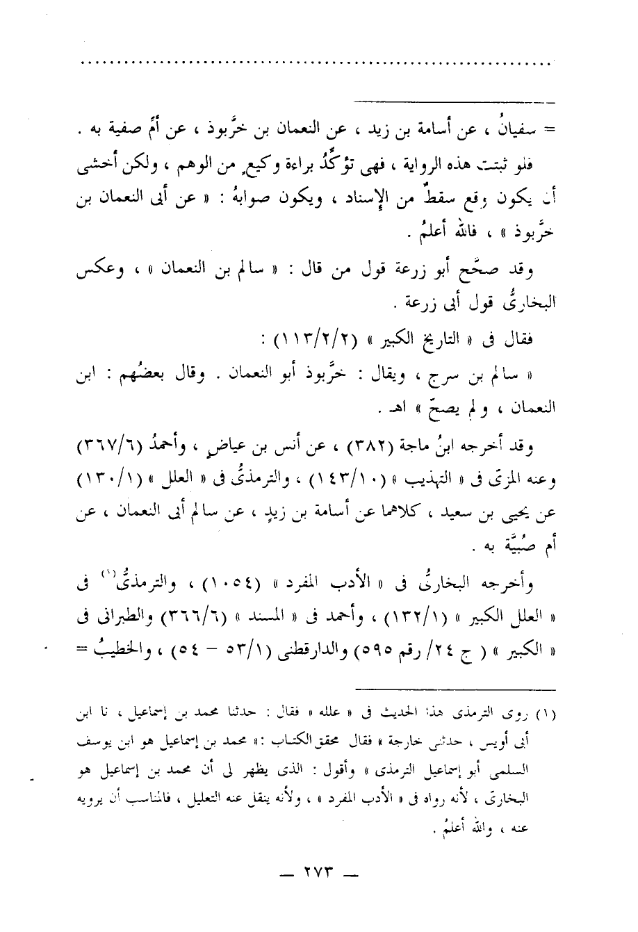 (¬1) روى الترمذى هذا الحديث في "علله" فقال: حدثنا محمد بن إسماعيل، نا ابن أبي أويس، حدثني خارجة، فقال محقق الكتاب: "محمد بن إسماعيل هو ابن يوسف السلمى أبو إسماعيل الترمذى" وأقول: الذي يظهر لي أن محمد بن إسماعيل هو البخارىّ، لأنه رواه في "الأدب المفرد"، ولأنه ينقل عنه التعليل، فالمناسب أن يرويه عنه، والله أعلمُ.