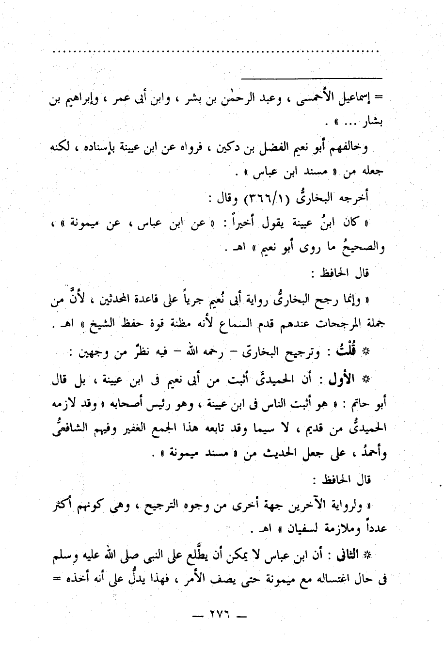 * الأول: أن الحميديَّ أثبت من أبي نعيم في ابن عينة، بل قال أبو حاتم: "هو أثبت الناس في ابن عيينة، وهو رئيس أصحابه" وقد لازمه الحميدي من قديم، لا سيما وقد تابعه هذا الجمع الغفير وفيهم الشافعيُّ وأحمدُ، على جعل الحديث من "مسند ميمونة".