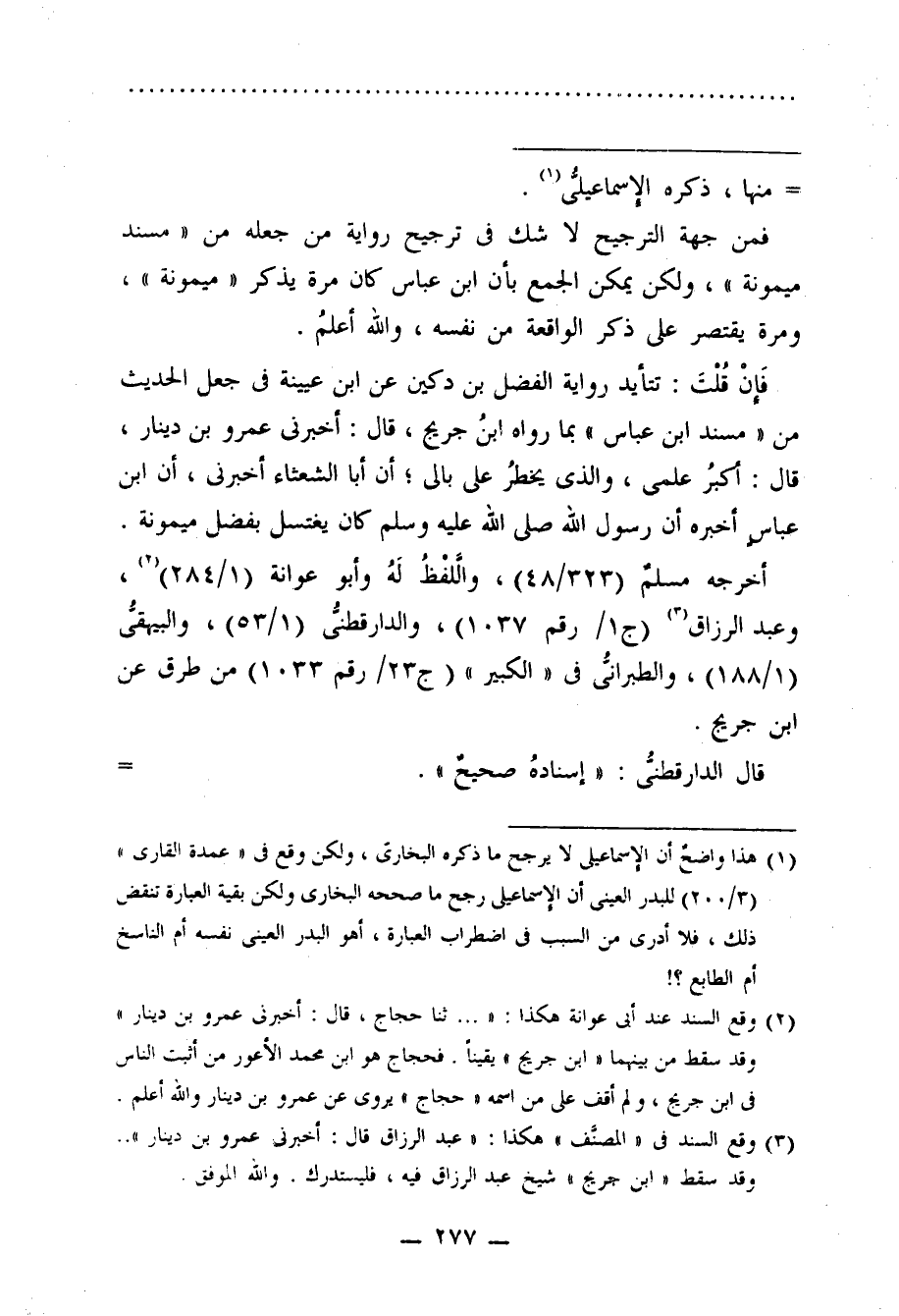 (¬1) هذا واضحٌ أن الإسماعيلي لا يرجح ما ذكره البخاري، ولكن وقع في "عمدة القارى" (3/ 200) للبدر العينى أن الإسماعيلى رجع ما صححه البخاري ولكن بقية العبارة تنقض ذلك، فلا أدرى من السبب في اضطراب العبارة، أهو البدر العيني نفسه أم الناسخ أم الطابع؟.