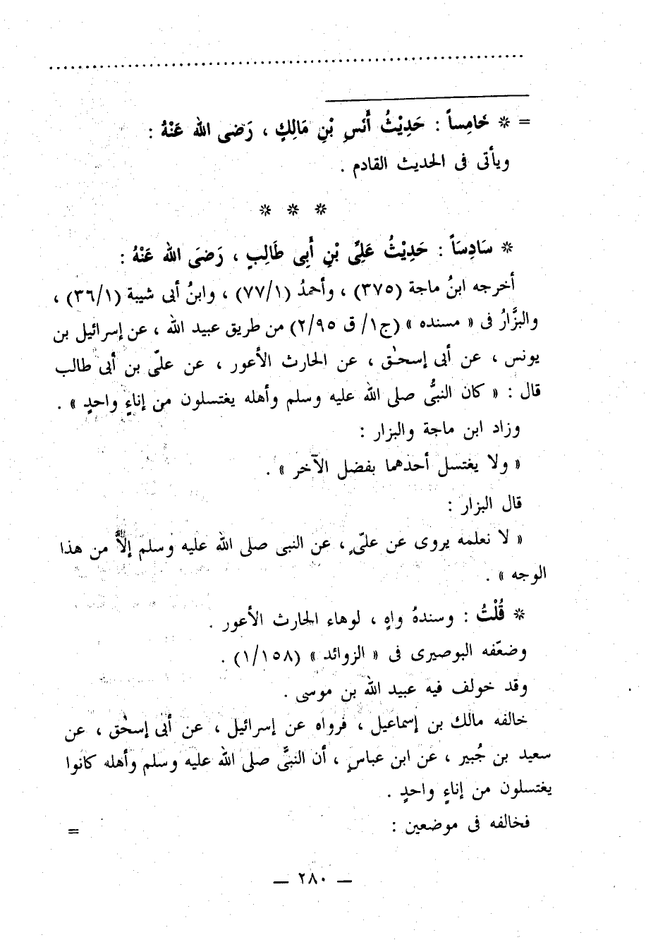 أخرجه ابنُ ماجة (375)، وأحمدُ (1/ 77)، وابنُ أبي شيبة (1/ 36)، والبزَّارُ في "مسنده" (ج1 / ق 95/ 2) من طريق عبيد الله، عن إسرائيل بن يونس، عن أبي إسحق، عن الحارث الأعور، عن علي بن أبي طالب قال: "كان النبيُّ صلى الله عليه وسلم وأهله يغتسلون من إناءٍ واحدٍ".