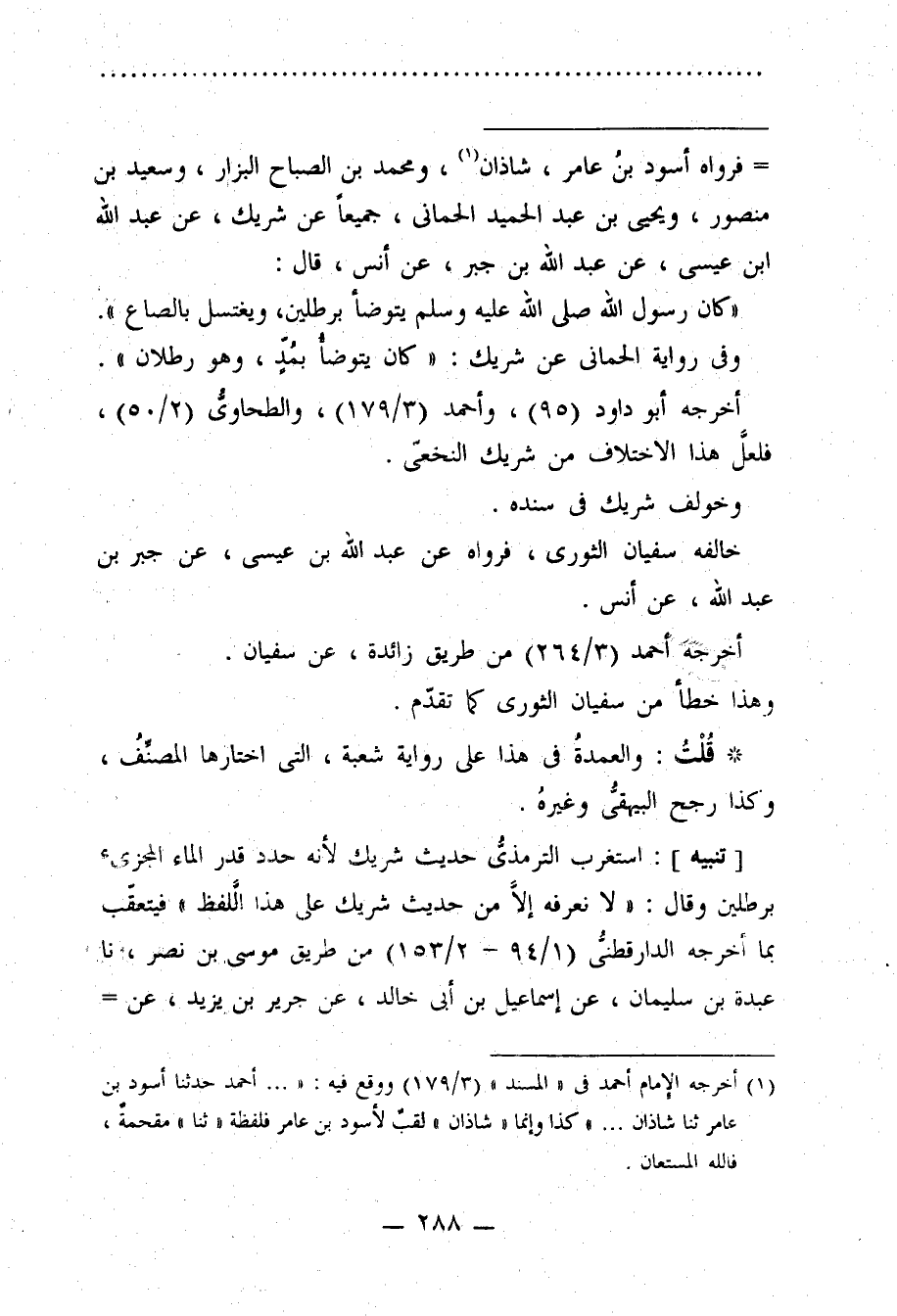 [تنبيه]: استغرب الترمذي حديث شريك لأنه حدد قدر الماء المجزىء برطلين وقال: "لا نعرفه إلَّا من حديث شريك على هذا الَّلفظ" فيتعقّب بما أخرجه الدارقطني (1/ 94 - 2/ 153) عن طريق موسى بن نصر، نا عبدة بن سليمان، عن إسماعيل ابن أبي خالد، عن جرير بن يزيد، عن =