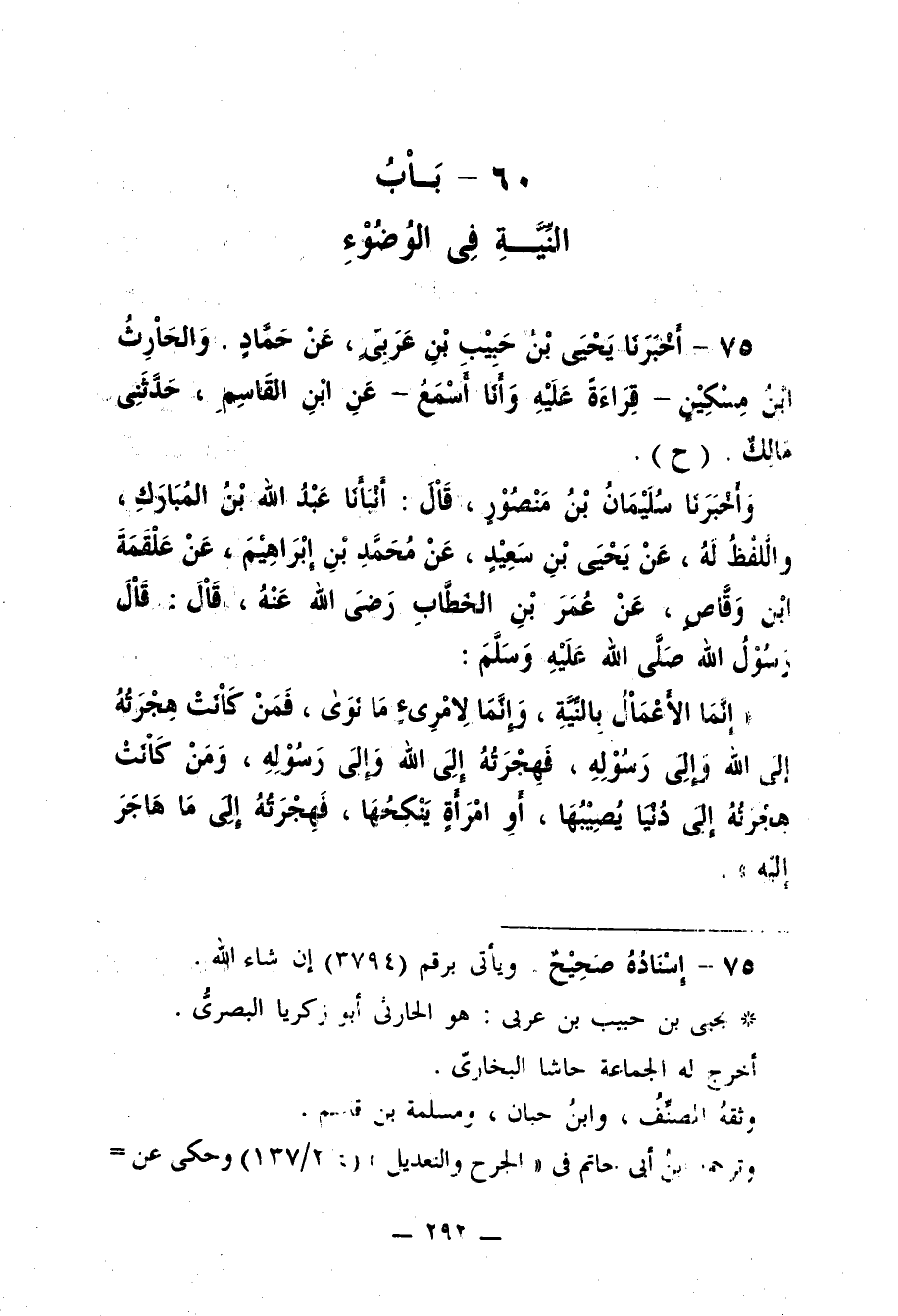 75 - أَخْبَرَنَا يَحْيَى بْنُ حَبِيبِ بْنِ عَرَبِىٍّ عَنْ حَمَّادٍ وَالْحَارِثُ بْنُ مِسْكِينٍ قِرَاءَةً عَلَيْهِ وَأَنَا أَسْمَعُ عَنِ ابْنِ الْقَاسِمِ حَدَّثَنِى مَالِكٌ ح وَأَخْبَرَنَا سُلَيْمَانُ بْنُ مَنْصُورٍ قَالَ أَنْبَأَنَا عَبْدُ اللَّهِ بْنُ الْمُبَارَكِ - وَاللَّفْظُ لَهُ - عَنْ يَحْيَى بْنِ سَعِيدٍ عَنْ مُحَمَّدِ بْنِ إِبْرَاهِيمَ عَنْ عَلْقَمَةَ بْنِ وَقَّاصٍ عَنْ عُمَرَ بْنِ الْخَطَّابِ - رضى الله عنه - قَالَ قَالَ رَسُولُ اللَّهِ -صلى الله عليه وسلم- «إِنَّمَا الأَعْمَالُ بِالنِّيَّةِ وَإِنَّمَا لاِمْرِئٍ مَا نَوَى فَمَنْ كَانَتْ هِجْرَتُهُ إِلَى اللَّهِ وَإِلَى رَسُولِهِ فَهِجْرَتُهُ إِلَى اللَّهِ وَإِلَى رَسُولِهِ وَمَنْ كَانَتْ هِجْرَتُهُ إِلَى دُنْيَا يُصِيبُهَا أَوِ امْرَأَةٍ يَنْكِحُهَا فَهِجْرَتُهُ إِلَى مَا هَاجَرَ إِلَيْهِ».