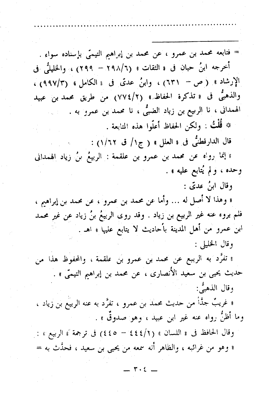 "تفرَّد به الربيع عن محمد بن عمرو بن علقمة، والمحفوظ هذا من حديث يحيى بن سعيد الأنصارى، عن محمد بن إبراهيم التيمي".