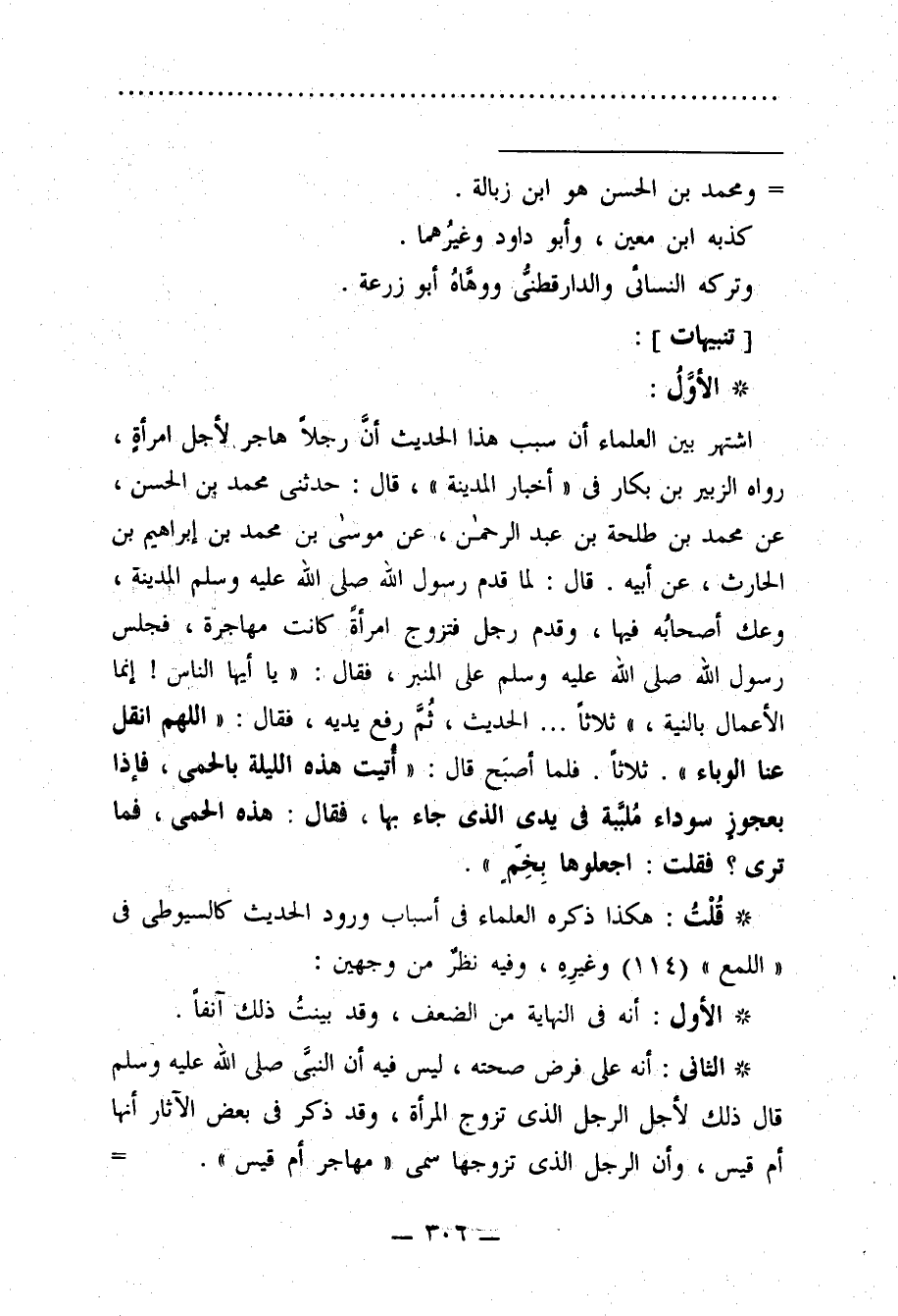 * الثانى: أنه على فرض صحته، ليس فيه أن النبيَّ صلى الله عليه وسلم قال ذلك لأجل الرجل الذي تزوج المرأة، وقد ذكر في بعض الآثار أنها أم قيس، وأن الرجل الذي تزوجها سمى "مهاجر أم قيس". =