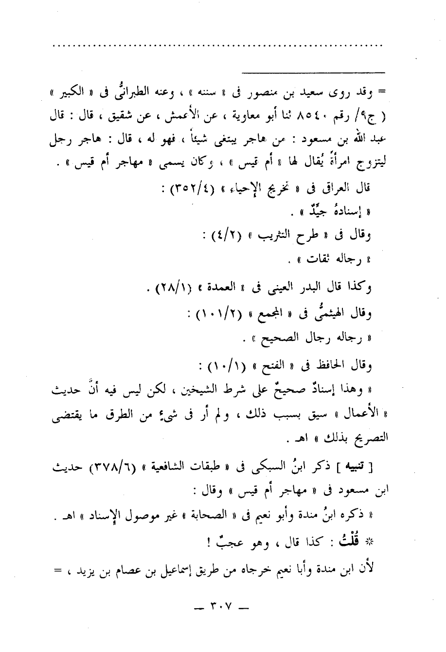= وقد روى سعيد بن منصور في "سننه"، وعنه الطبرانيُّ في "الكبير" (ج 9/ رقم 8540) ثنا أبو معاوية، عن الأعمش، عن شقيق, قال: قال عبد الله بن مسعود: من هاجر يبتغى شيئًا، فهو له، قال: هاجر رجل ليتزوج امرأةً يُقال لها "أم قيس"، وكان يسمى "مهاجر أم قيس".