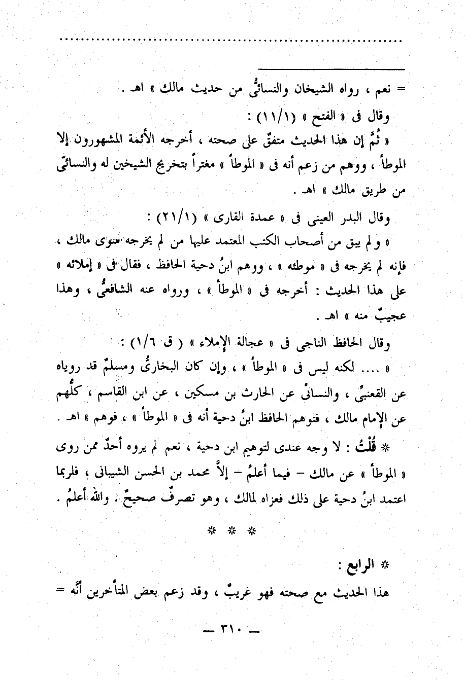 " .... لكنه ليس في "الموطأ"، وإن كان البخاريُّ ومسلمٌ قد روياه عن القعنبىِّ، والنسائى عن الحارث بن مسكين، عن ابن القاسم، كلُّهم عن الإمام مالك، فتوهم الحافظ ابنُ دحية أنه في "الموطأ"، فوهم" اهـ.