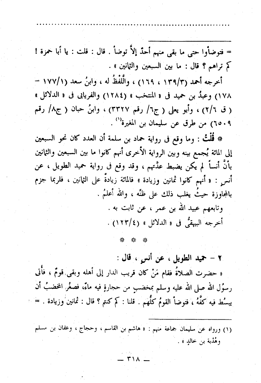 * قُلْتُ: وما وقع في رواية حماد بن سلمة أن العدد كان نحو السبعين إلى المائة يُجمع بينه وبين الرواية الأخرى أنهم كانوا ما بين السبعين والثمانين بأنَّ أنسًا لم يكن يضبط عدَّتهم، وقد وقع في رواية حميد لمطويل، عن أنسٍ: "أنهم كانوا ثمانين وزيادة" فالمائة زيادةٌ على الثمانين، فلربما جزم بالمجاوزة حيثُ يغلب ذلك على ظنِّه، والله أعلمُ.