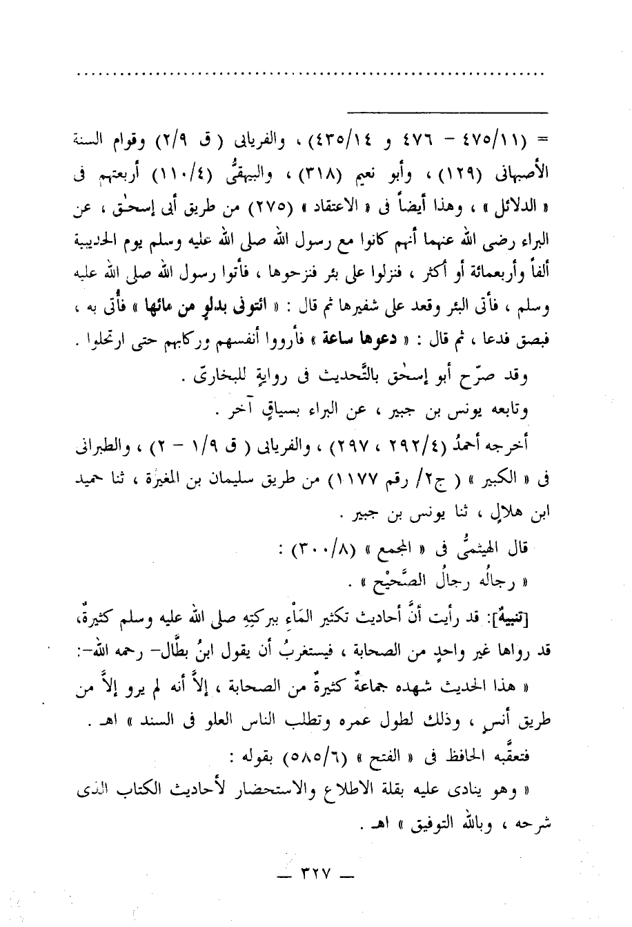 = (11/ 475 - 476 و 14/ 435)، والفريابى (ق 9/ 2) وقوام السنة الأصبهانى (129)، وأبو نعيم (318)، والبيهقيُّ (4/ 110) أربعتهم في "الدلائل"، وهذا أيضًا في "الاعتقاد" (275) من طريق أبي إسحق، عن البراء رضي الله عنهما أنهم كانوا مع رسول الله صلى الله عليه وسلم يوم الحديبية ألفًا وأربعمائة أو أكثر، فنزلوا على بئر فنزحوها، فأتوا رسول الله صلى الله عليه وسلم، فأتى البئر وقعد على شفيرها ثم قال: "ائتونى بدلوٍ من مائها" فأتى به، فبصق فدعا، ثم قال: "دعوها ساعة" فأرووا أنفسهم وركابهم حتى ارتحلوا.