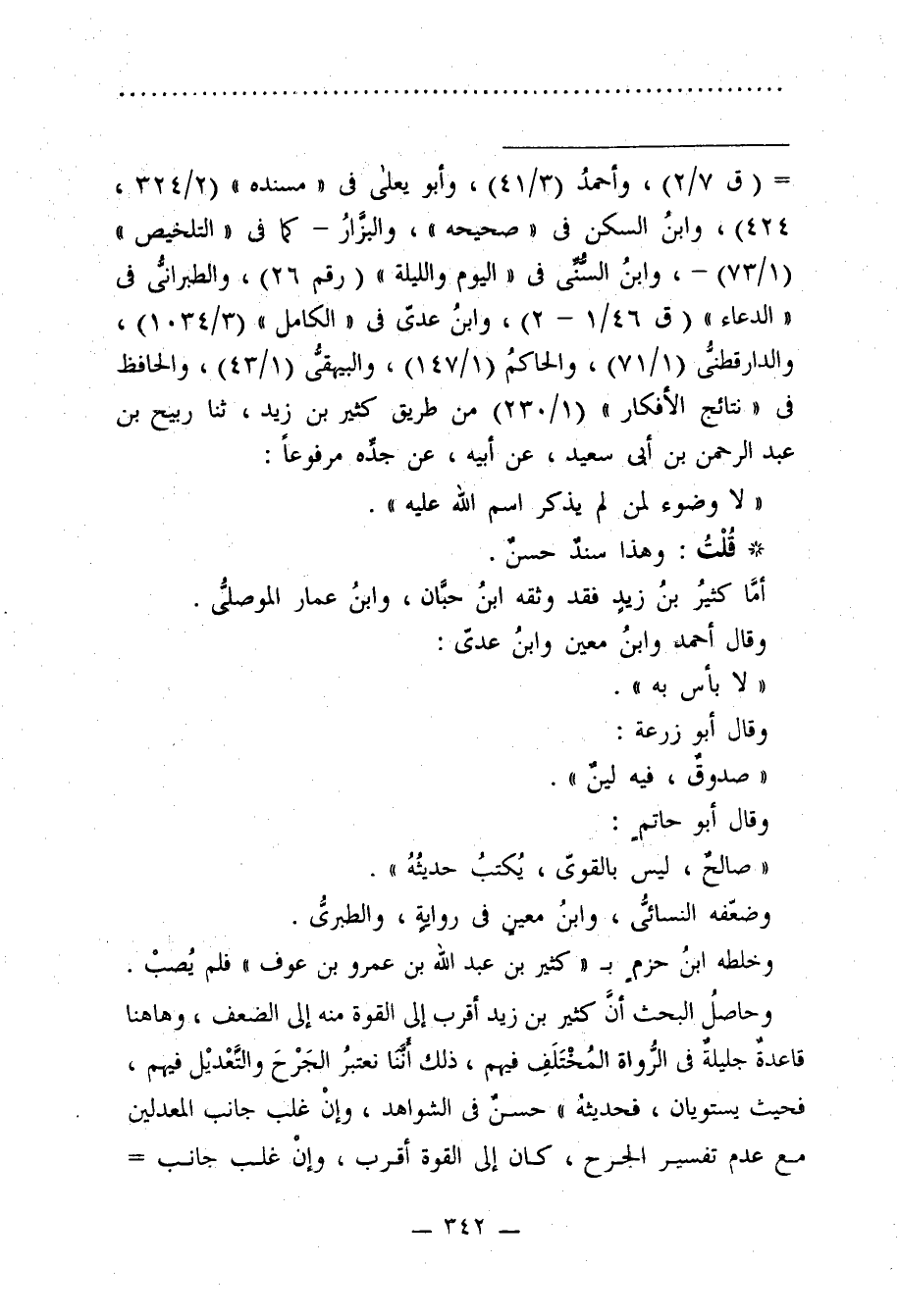 وحاصلُ البحث أنَّ كثير بن زيد أقرب إلى القوة منه إلى الضعف، وها هنا قاعدةٌ جليلةٌ في الرواة المُخْتَلَفِ فيهم، ذلك أَنَّنا نعتبرُ الجَرْحَ والتَّعْديْل فيهم، فحيث يستويان، فحديثهُ" حسنٌ في الشواهد، وإنْ غلب جانب المعدلين مع عدم تفسير الجرح، كان إلى القوة أقرب، وإنْ غلب جانب =