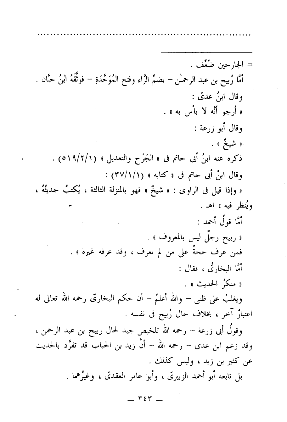وقولُ أبي زرعة -رحمه الله تلخيص جيد لحال ربيح بن عبد الرحمن، وقد زعم ابن عدي -رحمه الله- أبي زيد بن الحباب قد تفرَّد بالحديث عن كثير بن زيد، وليس كذلك.