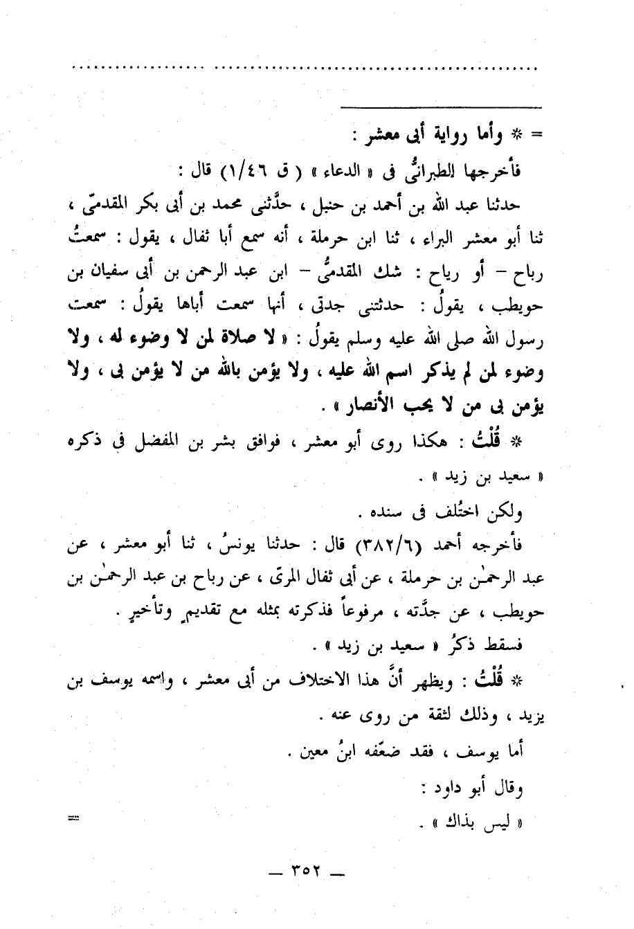 حدثنا عبد الله بن أحمد بن حنبل، حدَّثنى محمد بن أبي بكر المقدميّ، ثنا أبو معشر البراء، ثنا ابن حرملة، أنه سمع أبا ثفال، يقول: سمعتُ رباح -أو رياح: شك المقدميُّ- ابن عبد الرحمن بن أبي سفيان بن حويطب، يقول: حدثتني جدتي، أنها سمعت أباها يقولُ: سمعت، رسول الله صلى الله عليه وسلم يقولُ: "لا صلاة لمن لا وضوء له، ولا وضوء لمن لم يذكر اسم الله عليه، ولا يؤمن بالله من لا يؤمن بي، ولا يؤمن بي من لا يحب الأنصار".