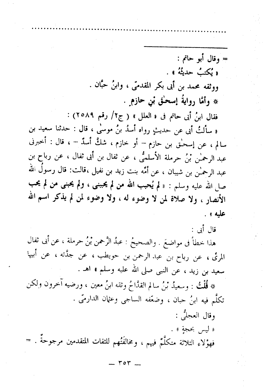"سألتُ أبي عن حديثٍ رواه أسدُ بنُ موسى، قال: حدثنا سعيد بن سالم، عن إسحق بن حازم -أو خازم، شكَّ أسدٌ-، قال: أخبرني عبد الرحمن بْنُ حرملة الأسلميُّ، عن ثفال بن أبي ثفال، عن رباح بن عبد الرحمن بن شيبان، عن أمِّه بنت زيد بن نفيل، قالت: قال رسولُ الله - صلى الله عليه وسلم -: "لم يُحبب الله من لم يحببني، ولم يحبني من لم يحب الأنصار، ولا صلاة لمن لا وضوء له، ولا وضوء لمن لم يذكر اسم الله عليه".