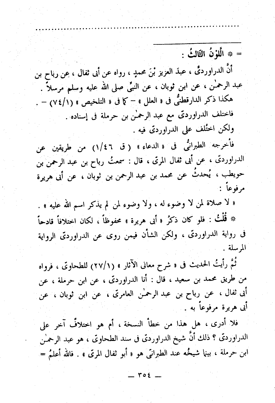 فلا أدرى، هل هذا من خطأ النسخة، أم هو اختلافٌ آخر على الدراوردىّ؟ ذلك أنَّ شيخ الدراورديّ في سند الطحاويّ، هو عبد الرحمن ابن حرملة، بينما شيخُه عند الطبراني هو "أبو ثفال المريّ". فالله أعلمُ =
