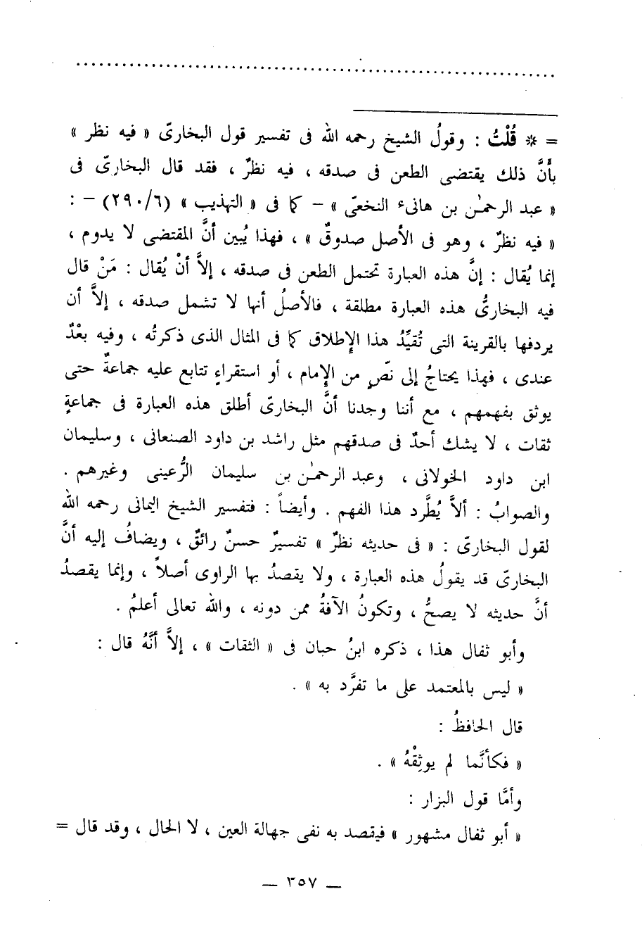 = * قُلْتُ: وقولُ الشيخ رحمه الله في تفسير قول البخارىّ "فيه نظر" بأنَّ ذلك يقتضي الطعن في صدقه، فيه نظرٌ، فقد قال البخارىّ في "عبد الرحمن بن هانئ النخعى" -كما في "التهذيب" (6/ 290) -: "فيه نظرٌ، وهو في الأصل صدوقٌ"، فهذا يُبين أنَّ المقتضى لا يدوم، إنما يُقال: إنَّ هذه العبارة تحتمل الطعن في صدقه، إلَّا أنْ يُقال: مَنْ قال فيه البخاريُّ هذه العبارة مطلقة، فالأصلُ أنها لا تشمل صدقه، إلا أن يردفها بالقرينة التي تُقيِّدُ هذا الإطلاق كما في المثال الذي ذكرتُه، وفيه بعْدٌ عندي، فهذا يحتاجُ إلى نَصٍّ من الإِمام، أو استقراءٍ تتابع عليه جماعةٌ حتى يوثق بفهمهم، مع أننا وجدنا أنَّ البخاريّ أطلق هذه العبارة في جماعةٍ ثقات، لا يشك أحدٌ في صدقهم مثل راشد بن داوث الصنعاني، وسليمان ابن داود الخولاني، وعبد الرحمن بن سليمان الرُّعينى وغيرهم. والصوابُ: ألَّا يُطَّرد هذا الفهم. وأيضًا: فتفسير الشيخ اليماني رحمه الله لقول البخارىّ: "في حديثه نظرٌ" تفسيرٌ حسنٌ رائقٌ، ويضافُ إليه أنَّ البخارىّ قد يقولُ هذه العبارة، ولا يقصدُ بها الراوى أصلًا، وإنما يقصدُ أنَّ حديثه لا يصحُّ، وتكونُ الآفةُ ممن دونه، والله تعالى أعلمُ.