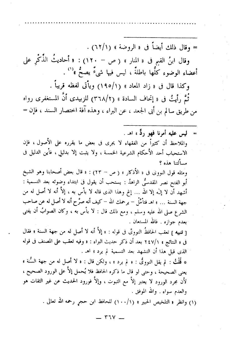 وقال ابنُ القيم في "المنار" (ص- 120): "أحاديثُ الذِّكْرِ على أعضاء الوضوء كلُّها باطلةٌ، ليس فيها شىءٌ يصحُّ" (¬1).