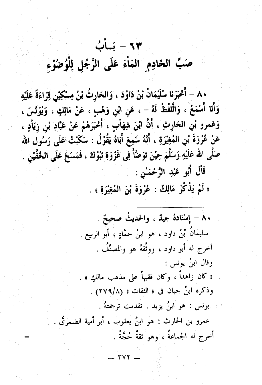 80 - أَخْبَرَنَا سُلَيْمَانُ بْنُ دَاوُدَ وَالْحَارِثُ بْنُ مِسْكِينٍ قِرَاءَةً عَلَيْهِ وَأَنَا أَسْمَعُ - وَاللَّفْظُ لَهُ - عَنِ ابْنِ وَهْبٍ عَنْ مَالِكٍ وَيُونُسَ وَعَمْرِو بْنِ الْحَارِثِ أَنَّ ابْنَ شِهَابٍ أَخْبَرَهُمْ عَنْ عَبَّادِ بْنِ زِيَادٍ عَنْ عُرْوَةَ بْنِ الْمُغِيرَةِ أَنَّهُ سَمِعَ أَبَاهُ يَقُولُ سَكَبْتُ عَلَى رَسُولِ اللَّهِ -صلى الله عليه وسلم- حِينَ تَوَضَّأَ فِى غَزْوَةِ تَبُوكَ فَمَسَحَ عَلَى الْخُفَّيْنِ. قَالَ أَبُو عَبْدِ الرَّحْمَنِ لَمْ يَذْكُرْ مَالِكٌ عُرْوَةَ بْنَ الْمُغِيرَةِ.