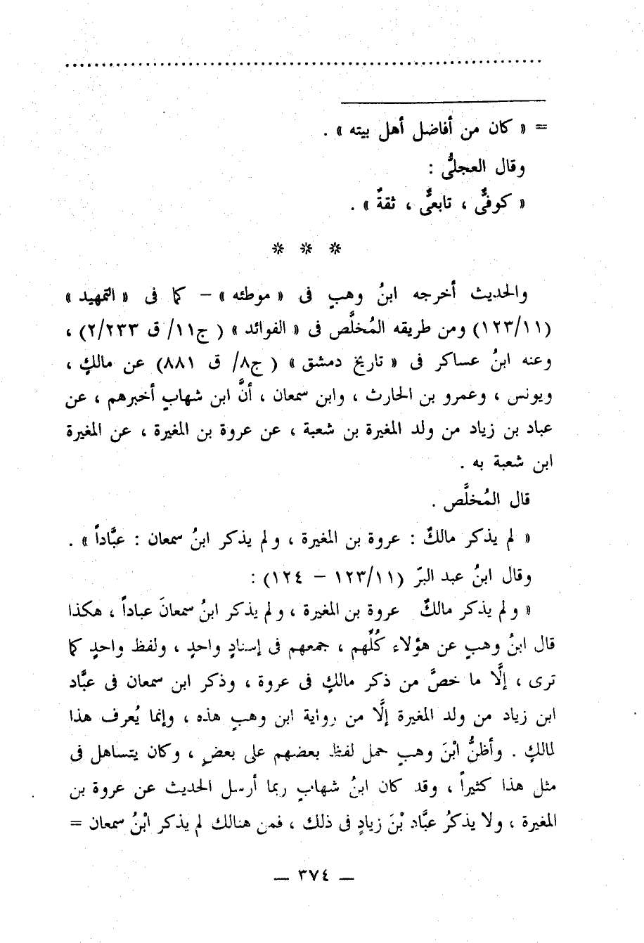 "ولم يذكر مالكٌ عروة بن المغيرة، ولم يذكر ابنُ سمعانَ عبادًا, هكذا قال ابنُ وهبٍ عن هؤلاء كُلِّهم، جمعهم في إسنادٍ واحدٍ، ولفظ واحدٍ كما ترى، إلَّا ما خصَّ من ذكر مالكٍ في عروة، وذكر ابن سمعان في عبَّاد ابن زياد من ولد المغيرة إلَّا من رواية ابن وهبٍ هذه، وإنما يُعرف هذا لمالكٍ. وأظنُّ ابْنَ وهبٍ حمل لفظ بعضهم على بعضٍ، وكان يتساهل في مثل هذا كثيرًا، وقد كان ابنُ شهابٍ ربما أرسل الحديث عن عروة بن المغيرة، ولا يذكرُ عبَّاد بْنَ زيادٍ في ذلك، فمن هنالك لم يذكر ابْنُ سمعان =