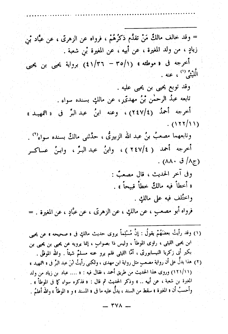 (¬2) هذا يدلُّ على أن رواية مصعبٍ مثل رواية ابن مهدى، ولكنى رأيتُ ابْنَ عبد البرِّ في "التمهيد" (11/ 121) وروى هذا الحديث من طريق أحمد، فقال فيه: " .... عباد بن زياد من ولد المغيرة بن شعبة، عن أبيه .. " وذكر الحديث ثم قال: "فذكره سواء كما في الموطأ". وأحسبُ أن "المغيرة" سقط من السند، يدلُّ عليه ما في "المسند" و"الموطأ" والله أعلمُ.