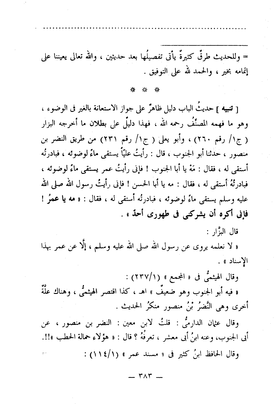 [تنبيه] حديثُ الباب دليل ظاهرٌ على جواز الاستعانة بالغير في الوضوء، وهو ما فهمه المصنِّفُ رحمه الله، فهذا دليلٌ على بطلان ما أخرجه البزار (ج1/ رقم 260)، وأبو يعلى (ج1/ رقم 231) من طريق النضر بن منصور، حدثنا أبو الجنوب، قال: رأيتُ عليًّا يستقى ماءً لوضوئه، فبادرتُه أستقى له، فقال: مَهْ يا أبا الجنوب! فإنى رأيتُ عمر يستقى ماءً لوضوئه، فبادرتُهُ أستقى له، فقال: مه يا أبا الحسن! فإنى رأيتُ رسول الله صلى الله عليه وسلم يستقى ماءً لوضوئه، فبادرتُه أستقى له، فقال: "مه يا عمرُ! فإنى أكره أن يشركنى في طهورى أحدٌ".