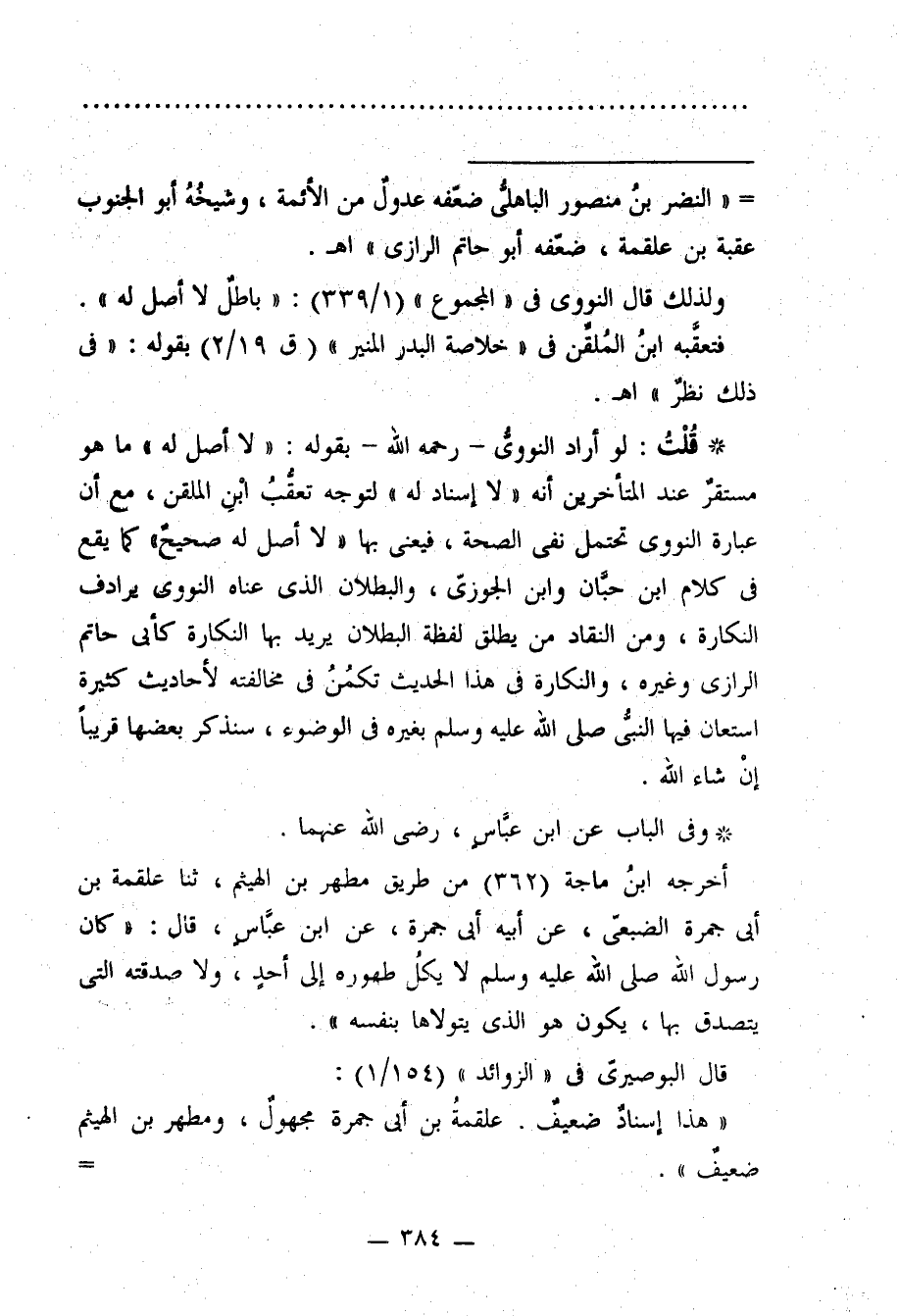 * قُلْتُ: لو أراد النوويُّ - رحمه الله - بقوله: "لا أصل له" ما هو مستقرٌ عند المتأخرين أنه "لا إسناد له" لتوجه تعقُّبُ ابْنِ الملقن، مع أن عبارة النووي تحتمل نفى الصحة، فيعنى بها "لا أصل له صحيحٌ" كما يقع في كلام ابن حبَّان وابن الجوزيّ، والبطلان الذي عناه النووي يرادف النكارة، ومن النقاد من يطلق لفظة البطلان يريد بها النكارة كأبي حاتم الرازى وغيره، والنكارة في هذا الحديث تكمُنُ في مخالفته لأحاديث كثيرة استعان فيها النبيُّ صلى الله عليه وسلم بغيره في الوضوء، سنذكر بعضها قريبًا إنْ شاء الله.