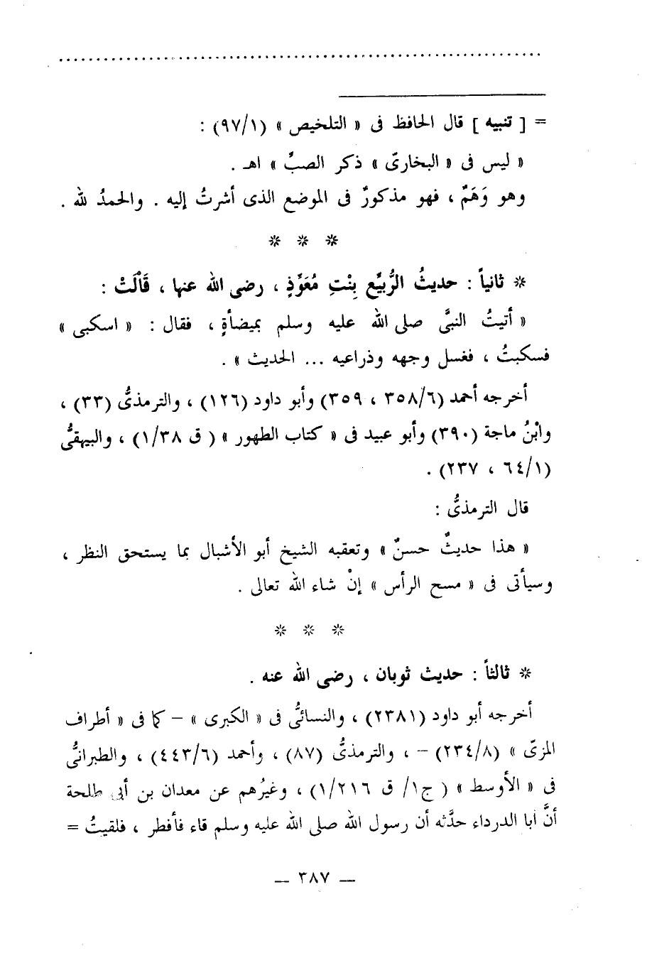 "هذا حديثٌ حسنٌ" وتعقبه الشيخ أبو الأشبال بما يستحق النظر، وسيأتي في "مسح الرأس" إنْ شاء الله تعالى.