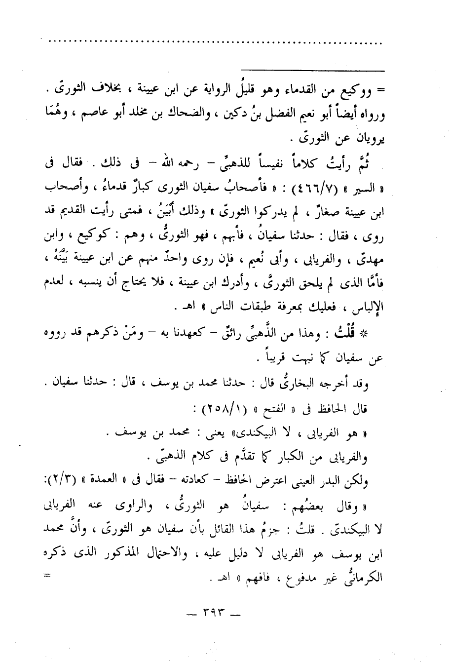 ثُمَّ رأيتُ كلامًا نفيسًا للذهبيِّ - رحمه الله - في ذلك. فقال في "السير" (7/ 466): "فأصحابُ سفيان الثورى كبارٌ قدماءُ، وأصحاب ابن عيينة صغارٌ، لم يدركوا الثورىّ" وذلك أبْيَنُ، فمتى رأيت القديم قد روى، فقال: حدثنا سفيانُ، فأبهم، فهو الثوريُّ، وهم: كوكيع، وابن مهدىّ، والفريابى، وأبي نُعيم، فإن روى واحدٌ منهم عن ابن عيينة بَيَّنَةُ، فأمَّا الذي لم يلحق الثورىَّ، وأدرك ابن عيينة، فلا يحتاج أن ينسبه، لعدم الإلباس، فعليك بمعرفة طبقات الناس" اهـ.