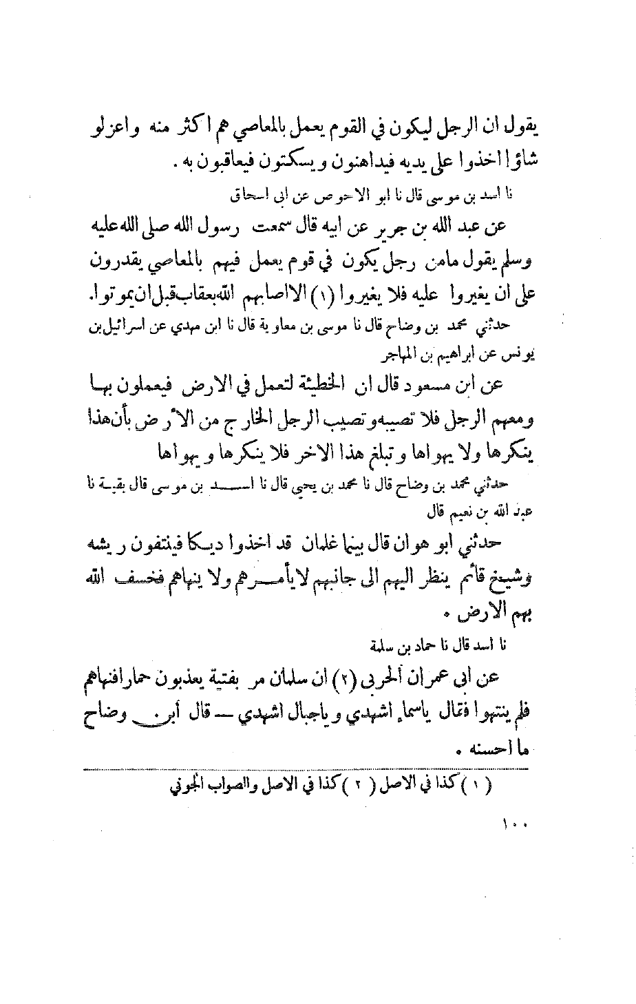 حدثني محمد بن وضاح قال نا موسى بن معاوية قال نا أبن مهدي عن إسرائيل بن يونس عن إبراهيم بن المهاجر عن أبن مسعود قال إن الخطيئة لتعمل في الأرض فيعملون بها ومعهم الرجل فلا تصيب الرجل الخارج من الأرض بأن هذا ينكرها ولا يهواها وتبلغ هذا الآخر فلا ينكرها ويهواها حدثني محمد بن وضاح قال نا محمد بن يحيى قال نا أسد بن موسى قال بقية نا عبد الله بن نعيم قال حدثني أبو هوان قال بينما غلمان قد اخذوا ديكا فينتفون ريشه وشيخ قائم ينظر إليهم إلى جانبهم لا يأمرهم ولا ينهاهم فخسف الله بهم الأرض.