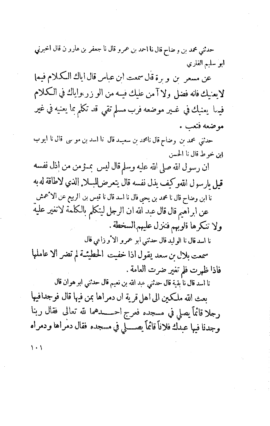 حدثني محمد بن وضاح قال أحمد بن عمرو اقل نا جعفر بن هارون قال أخبرني أبو سليم القارئ عن معسر بن وبرة قال سمعت أبن عباس قال إياك الكلام فيما لا يعنيك فإنه فضل ولا آمن عليك فيه من الوزر، وإياك في الكلام فيما يعنيك في غير موضعه قرب مسلم تقي قد تكلم بما يعنيه في غير موضعه فتعب.