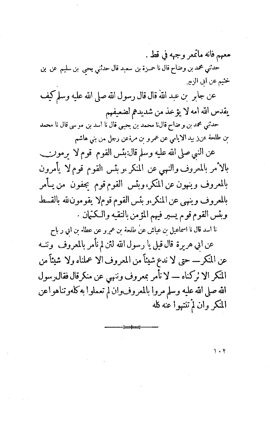 حدثني محمد بن وضاح قال نا حمزة بن سعيد قال حدثني يحيى بن سليم عن بن خشيم عن أبي الزبير عن جابر بن عبد الله قال قال رسول الله صلى الله عليه وسلم كيف يقدس الله أمة لا يؤخذ من شديدهم لضعيفهم حدثني محمد بن وضاح قال نا محمد بن يحيى قال نا أسد بن موسى قال نا محمد بن طلحة عن زبيد الأيامي عن عمرو بن مرة عن رجل من بني هاشم عن النبي صلى الله عليه وسلم قال: بئس القوم قوم لا يرمون بالأمر بالمعروف والنهي عن المنكر، وبئس القوم قوم لا يأمرون بالمعروف وينهون عن المنكر، وبئس القوم قوم يجفون من يأمر بالمعروف وينهي عن المنكر، وبئس القوم قوم لا يقومون لله بالقسط وبئس القوم قوم يسير فيهم المؤمن بالتقية والكتمان.