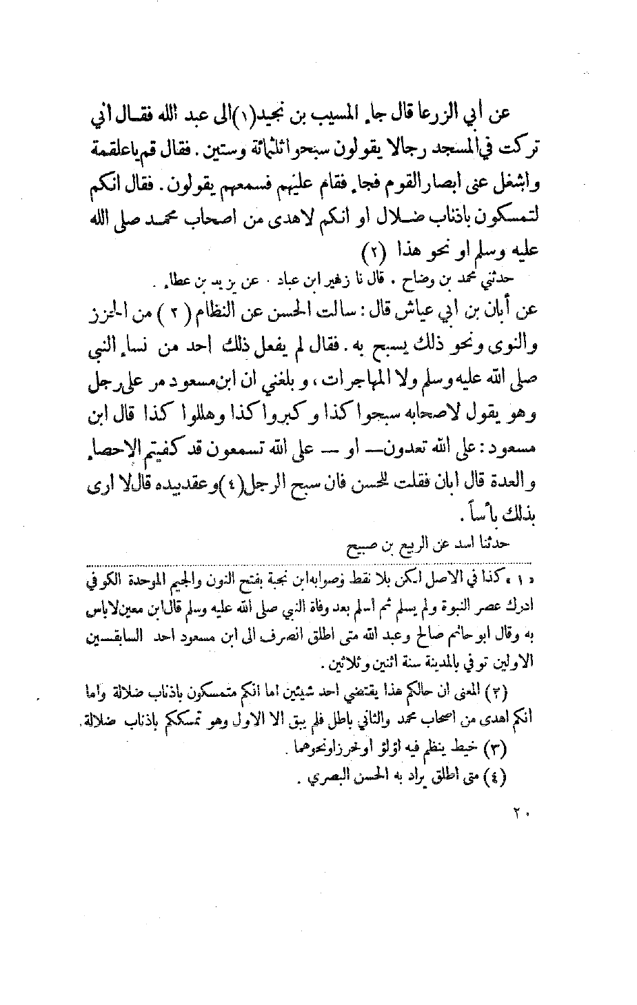 عن أبي الزرعا قال جاء المسيب بن نجيد إلى عبد الله فقال أني تركت في المسجد رجالاً يقولون سبحوا ثلاثمائة وستين. فقال قم يا علقمة وأشغل عني أبصار القوم فجاء فقام عليهم فسمعهم يقولون. فقال أنكم لتمسكون بأذناب ضلال أو أنكم لأهدى من أصحاب محمد صلى الله عليه وسلم أو نحو هذا حدثني محمد بن وضاح. قال نا زهير أبن عباد. عن يزيد بن عطاء. عن أبان بن أبي عياش قال: سألت الحسد عن النظام من الحزز والنوى ونحو ذلك يسبح به. فقال لم يفعل ذلك أحد من نساء النبي صلى الله عليه وسلم ولا المهاجرات، وبلغني إن أبن مسعود مر على رجل وهو يقول لأصحابه سبحوا كذا وكبروا كذا وهللوا كذا قال أبن مسعود: على الله تعدون- أو- على الله تسمعون قد كفيتم الإحصاء والعدة قال أبان فقلت للحسن فأن سبح الرجل وعقد بيده قال لا أرى بذلك بأساً.