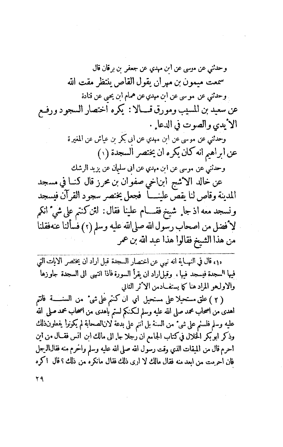 وحدثني عن موسى عن أبن مهدي عن أبي بكر بن عياش عن المغيرة عن إبراهيم أنه كان يكره أن يختصر السجدة وحدثني عن موسى عن أبن مهدي عن أبي سليمان عن يزيد الرشك عن خالد الأشج أبن أخي صفوان بن محرز قال كنا في مسجد المدينة وقاص لنا يقص علينا فجعل يختصر سجود القرآن فيسجد ونسجد معه إذ جاء شيخ فقام علينا فقال: لئن كنتم على شيء أنكم لأفضل من أصحاب رسول الله صلى الله عليه وسلم فسألنا عنه فقلنا من هذا الشيخ فقالوا هذا عبد الله بن عمر