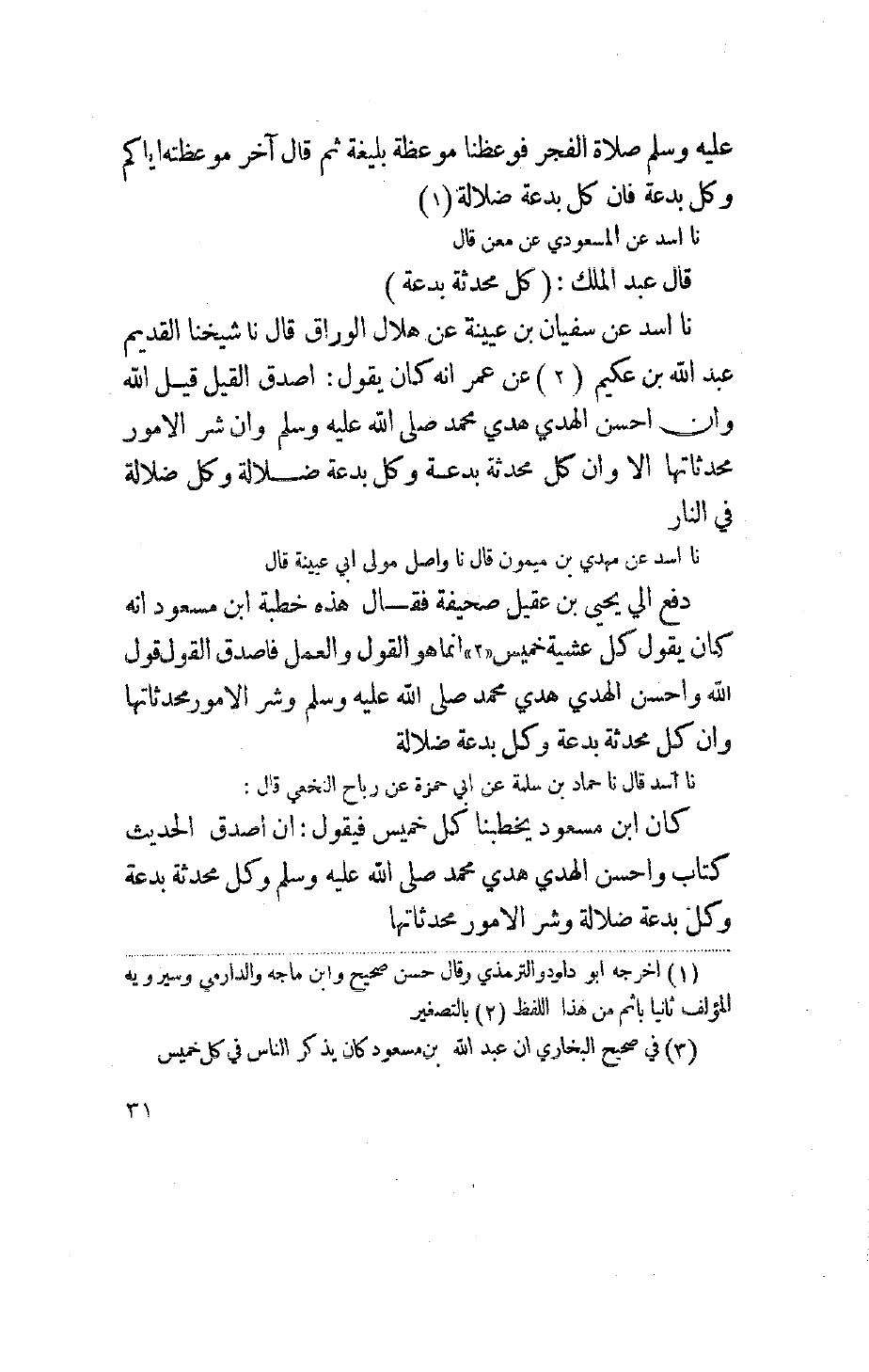 عليه وسلم صلاة الفجر فوعظنا موعظة بليغة ثم قال آخر موعظته إياكم وكل بدعة فأن كل بدعة ضلالة نا أسد عن المسعودي عن معن قال قال عبد الملك: "كل محدثة بدعة" نا أسد عن سفيان بن عيينة عن هلال الوراق قال نا شيخنا القديم عبد الله بن عكيم عن عمر أنه كان يقول: أصدق القيل قيل لله وأن احسن الهدي هدي محمد صلى الله عليه وسلم وإن أشر الأمور محدثاتها ألا وإن كل محدثة بدعة وكل بدعة ضلالة وكل ضلالة في النار نا أسد عن مهدي بن ميمون قال نا واصل مولى أبي عيينة قال دفع إلي يحيى بن عقيل صحيفة فقال هذه خطبة أبن مسعود أنه كان يقول كل عشية خميس إنما هو القول والعمل فأصدق القول قول الله واحسن الهدي هدي محمد صلى الله عليه وسلم وشر الأمور محدثاتها وأن كل محدثة بدعة وكل بدعة ضلالة