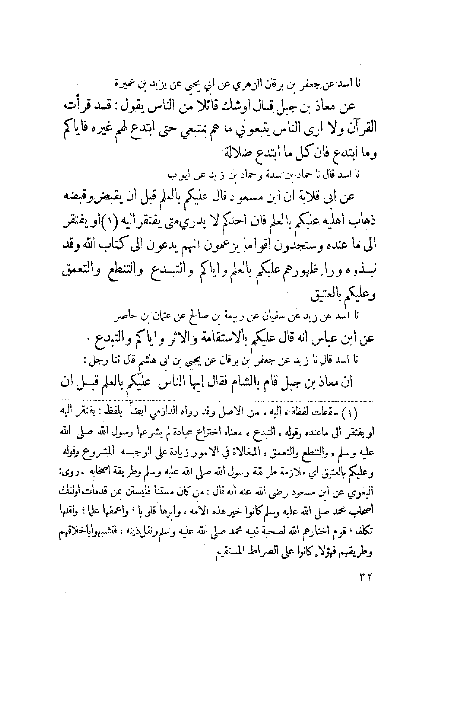 نا أسد قال نا حماد بن سلمة عن أبي حمزة عن رباح النخعي قال: كان أبن مسعود يخطبنا كل خميس فيقول أن اصدق الحديث كتاب واحسن الهدي هدي محمد صلى الله عليه وسلم وكل محدثة بدعة وكل بدعة ضلالة وشر الأمور محدثاتها نا أسد عن جعفر بن برقان الزهري عن أبي يحيى عن زيد بن عميرة عن معاذ بن جبل قال أوشك قائلاً من الناس يقول: قد قرأت القرآن ولا أرى الناس يتبعوني ما هم بمتبعي حتى أبتدع لهم غيره فإياكم وما ابتدع فأن كل ما ابتدع ضلالة نا أسد قال نا حماد بن سلمة وحماد بن زيد عن أيوب عن أبي قلابة إن أبن مسعود قال عليكم بالعلم قبل أن يقبض وقبضه