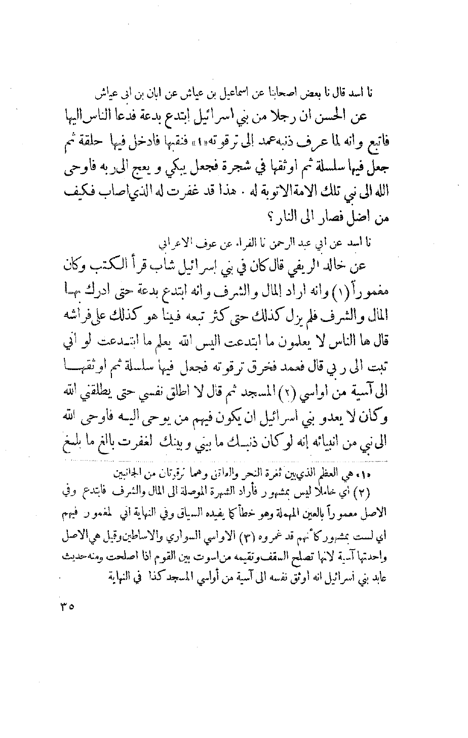 نا أسد قال نا بعض أصحابنا عن إسماعيل بن عياش عن أبان بن أبي عياش عن الحسن عن رجلاً من بني إسرائيل ابتدع بدعة فدعا الناس إليها فأتُبع وأنه لما عرف ذنبه عمد إلى ترقوته فنقبها فأدخل فيها حلقة ثم جعل فيها سلسلة ثم أوثقها في شجرة فجعل يبكي ويعج إلى ربه فأوحى الله إلى نبي تلك الأمة ألا توبة له. هذا قد غفرت له الذي أصاب فكيف من أضل فصار إلى النار? نا أسد عن أبي عبد الرحمن نا الفراء عن عوف الأعرابي عن خالد الريفي قال كان بني إسرائيل شاب قرأ الكتب وكان مغموراً وأنه أراد المال والشرف وأنه ابتدع بدعة حتى أدرك بها المال والشرف فلم يزل كذلك حتى كثر تبعه فينا هو كذلك على فراشه قال ها الناس لا يعلمون ما ابتدعت أليس الله يعلم ما ابتدعت لو أني تبت إلى ربي قال فعمد فخرق ترقوته فجعل فيها سلسلة ثم أوثقها إلى آسية من أواسي المسجد ثم قال لا أطلق نفسي حتى يطلقني الله وكان لا يعدوا بني إسرائيل أن يكون فيهم من يوحى إليه فأوحى الله إلى نبي من أنبيائه إنه لو كان ذنبك ما بيني وبينك لغفرت بالغ ما بلغ