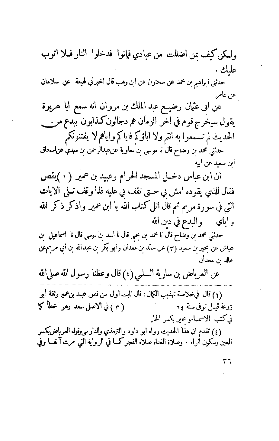 حدثني إبراهيم بن محمد عن سحنون عن أبي وهب قال أخبرني لهيعة عن سلامان عن عامر عن أبي عثمان رضيع عبد الملك بن مروان أنه سمع أبا هريرة يقول سيخرج قوم في آخر الزمان هم دجالون كذابون ببدع من الحديث لم تسمعوا به أنتم ولا آباؤكم فإياكم وإياهم لا يفتنونكم حدثني محمد بن وضاح قال نا موسى بن معاوية عن عبد الرحمن بن مهدي عن إسحاق أبن سعيد عن أبيه أن أبن عباس دخل المسجد الحرام وعبيد بن عمير يقص فقال للذي يقوده أمش بي حتى تقف بي عليه فلما وقف تلى الآيات التي في سورة مريم ثم قال أتل كتاب الله يا أبن عمير واذكر ذكر الله وإياي والبدع في دين الله حدثني محمد بن وضاح قال نا محمد بن يحيى قال نا أسد بن موسى قال نا إسماعيل بن عياش عن بحير بن سعيد عن خالد بن معدان وأبو بكر بن عبد الله بن أبي مريم عن خالد بن معدان عن العرباض بن سارية السلمي قال وعظنا رسول الله