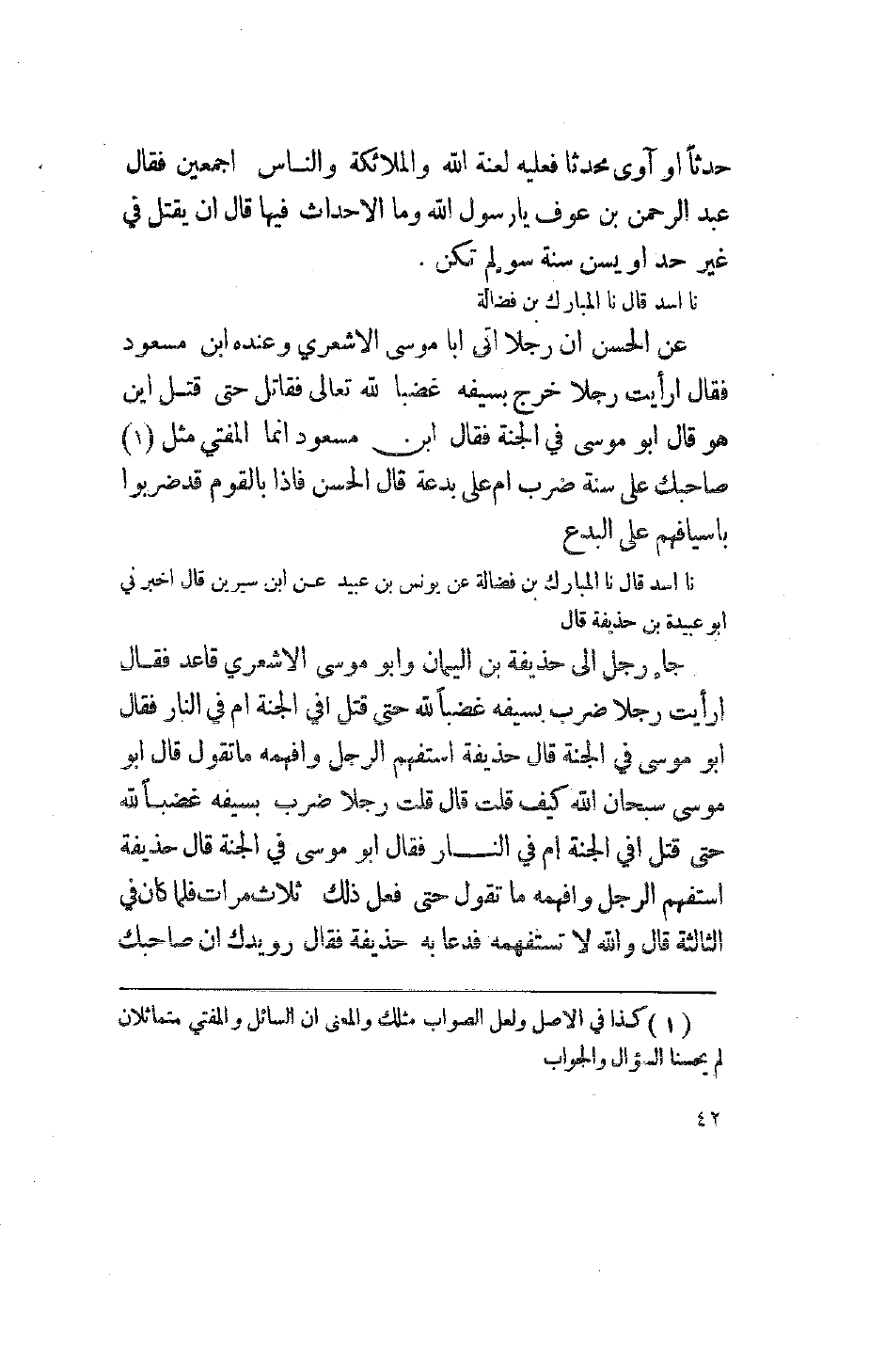 نا أسد قال نا المبارك بن فضالة عن الحسن أن رجلاً أتى أبا موسى الأشعري وعنده أبن مسعود فقال ارأيت رجلاً خرج بسيفه غضباً لله تعالى فقاتل حتى قتل أين هو قال أبو موسى في الجنة فقال أبن مسعود إنما المفتي مثل صاحبك على سُنة ضرب أم على بدعة قال الحسن فإذا بالقوم قد ضربوا بأسيافهم على البدع نا أسد قال نا المبارك بن فضالة عن يونس بن عبيد عن أبن سيرين قال أخبرني أبو عبيدة بن حذيفة قال جاء رجل إلى حذيفة بن اليمان وأبو موسى الأشعري قاعد فقال ارأيت رجلاً ضرب بسيفه غضباً لله حتى قتل أفي الجنة أم في النار فقال أبو موسى في الجنة قال حذيفة أستفهم الرجل وافهمه ما تقول قال أبو موسى سبحان لله كيف قلت قال قلت رجلاً ضرب بسيفه غضباً لله حتى قتل أفي الجنة أم في النار فقال أبو موسى في الجنة قال حذيفة أستفهم الرجل وأفهمه ما تقول حتى فعل ذلك ثلاث مرات فلما كان في الثالثة قال والله لا تستفهمه فدعا به حذيفة فقال رويدك أن صاحبك