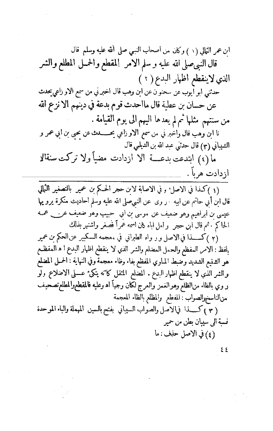 أبن عمر الثمالي وكان من أصحاب النبي صلى الله عليه وسلم قال قال النبي صلى الله عليه وسلم الأمر المقطع والحمل المطلع والشر الذي لا ينقطع إظهار البدع حدثني أبو أيوب عن سحنون عن أبي وهب قال أخبرني من سمع الاوزاعي يحدث عن حسان بن عطية قال ما أحدث قوم بدعة في دينهم إلا نزع الله من سنُتهم مثلها ثم لم يعدها إليهم إلى يوم القيامة.