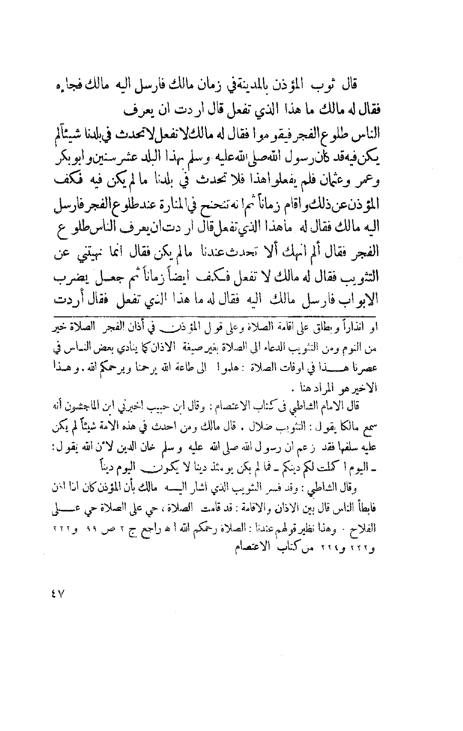قال ثوب المؤذن بالمدينة في زمان مالك فأرسل إليه مالك فجاءه فقال له مالك ما هذا الذي تفعل قال أردت أن يعرف الناس طلوع الفجر. فيقوموا، فقال له مالك لا تفعل لا تحدث في بلدنا شيئاً لم يكن فيه قد كان رسول الله صلى الله عليه وسلم بهذا البلد عشر سنين وأبو بكر وعمر وعثمان فلم يفعلوا هذا فلا تحدث في بلدنا ما لم يكن فيه فكف المؤذن عن ذلك وأقام زمناً ثم أنه تنحنح في المنارة عند طلوع الفجر فأرسل إليه مالك فقال له ما هذا الذي تفعل قال أردت أن يعرف الناس طلوع الفجر فقال ألم أنهك ألا تحدث عندنا ما لم يكن فقال إنما نهيتني عن التثويب فقال له مالك لا تفعل فكف أيضاً زمناً ثم جعل يضرب الأبواب فأرسل مالك إليه فقال ما هذا الذي تفعل فقال أردت