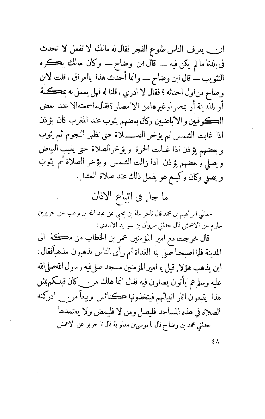 حدثني إبراهيم بن محمد قال ناحر ملة بن يحيى عن عبد الله بن وهب عن جرير بن حازم عن الأعمش قال حدثني مروان بن سويد الأسدي: قال خرجت مع أمير المؤمنين عمر بن الخطاب من مكة إلى المدينة فلما أصبحنا صلى بنا الغداة ثم رأى الناس يذهبون مذهباً فقال: أين يذهب هؤلاء قيل يا أمير المؤمنين مسجد صلى فيه رسول الله صلى الله عليه وسلم هم يأتون يصلون فيه فقال إنما هلك من كان قبلكم بمثل هذا يتبعون آثار أنبيائهم فيتخذونها كنائس وبيعاً من أدركته الصلاة في هذه المساجد فليصل ومن لا فليمض ولا يعتمدها حدثني محمد بن وضاح قال نا موسى بن معاوية قال نا جرير عن الأعمش
