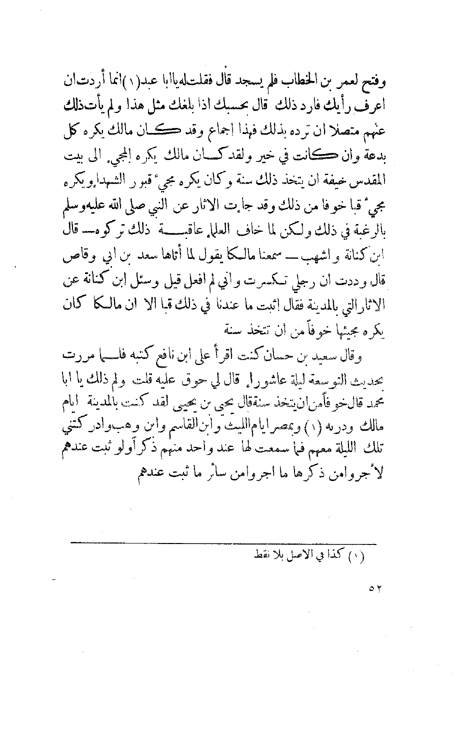 وفتح لعمر بن الخطاب فلم يسجد قال فقلت له يا أبا عبد إنما أردت أن أعرف رأيك فأرد ذلك قال بحسبك إذا بلغك مثل هذا ولم يأت ذلك عنهم متصلاً أن ترده بذلك فهذا إجماع وقد كان مالك يكره كل بدعة وأن كانت في خير ولقد كان مالك يكره كل بدعة وأن كانت في خير ولقد كان مالك يكره المجيء إلى بيت المقدس خيفة أن يتخذ ذلك سُنة وكان يكره مجيء قبور الشهداء ويكره مجيء قبا خوفاً من ذلك وقد جاءت الآثار عن النبي صلى الله عليه وسلم بالرغبة في ذلك ولكن لما خاف العلماء عاقبة ذلك تركوه- قال أبن كنانة وأشهب- سمعنا مالكاً يقول لما أتاها سعد بن أبي وقاص قال وددت أن رجلي تكسرت وأني لم أفعل قيل وسئل أبن كنانة عن الآثار التي بالمدينة فقال أثبت ما عندنا في ذلك قبا إلا أن مالكاً كان يكره مجيئها خوفاً من أن تتخذ سُنة وقال سعيد بن حسان كنت اقرأ على أبن نافع كتبه فلما مررت بحديث التوسعة ليلة عاشوراء قال لي حوق عليه قلت ولم ذلك يا أبا محمد قال خوفاً من أن يتخذ سُنة قال يحيى ين يحيى لقد كنت بالمدينة أيام مالك ودرية وبمصر أيام الليث وأبن القاسم وأبن وهب وأدركتني تلك الليلة معهم فما سمعت لها عند واحد منهم ذكراً ولو ثبت عندهم لأجروا من ذكرها ما أجروا من سائر ما ثبت عندهم