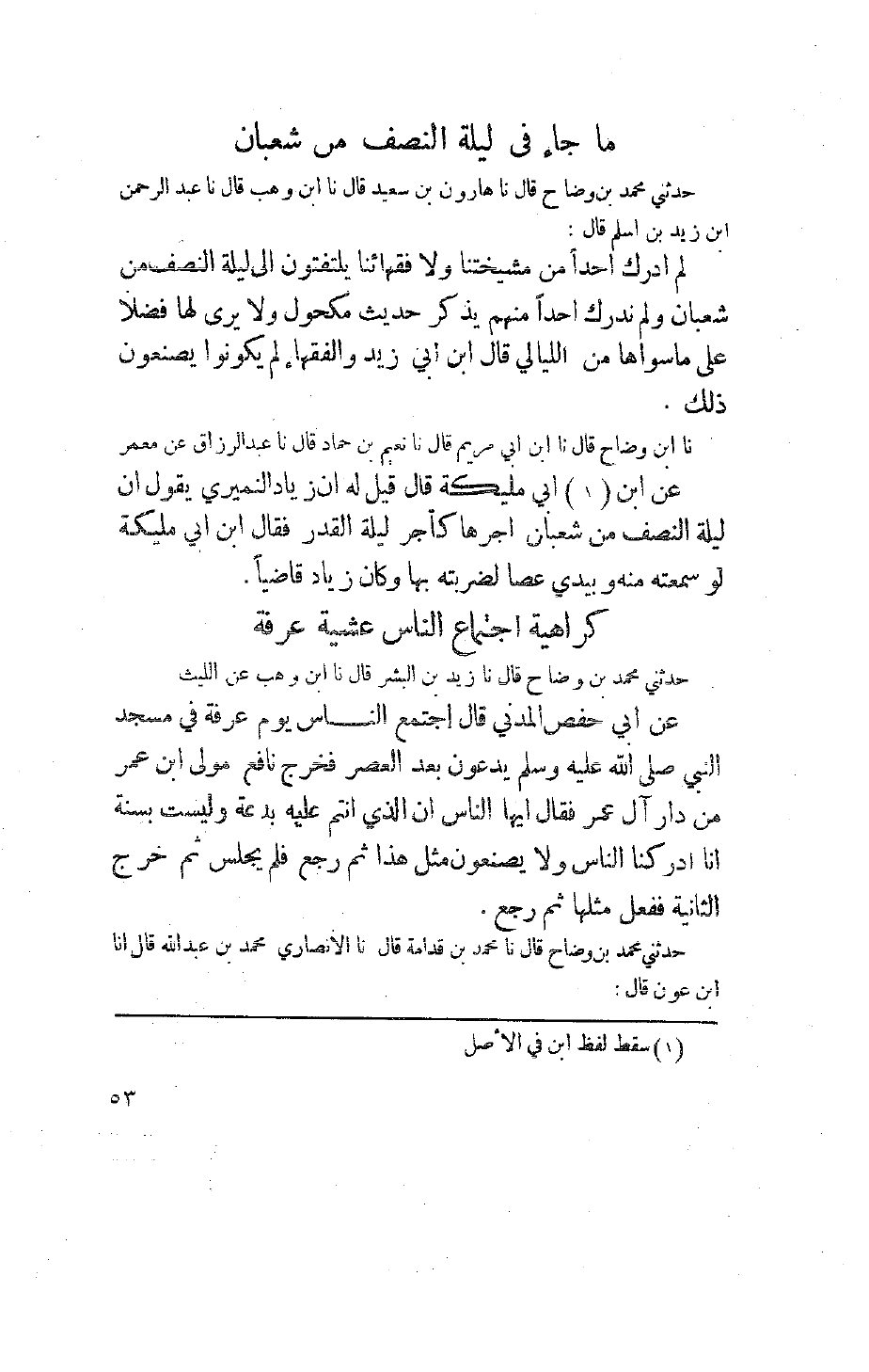 حدثني محمد بن وضاح قال نا هارون بن سعيد قال نا أبن وهب قال نا عبد الرحمن أبن زيد بن اسلم قال: لم أدرك أحداً من مشيختنا ولا فقهائنا يلتفتون إلى ليلة النصف من شعبان ولم ندرك أحداً منهم يذكر حديث مكحول ولا يرى لها فضلاً على ما سواها من الليالي قال أبن أبي زيد والفقهاء لم يكونوا يصنعون ذلك.
