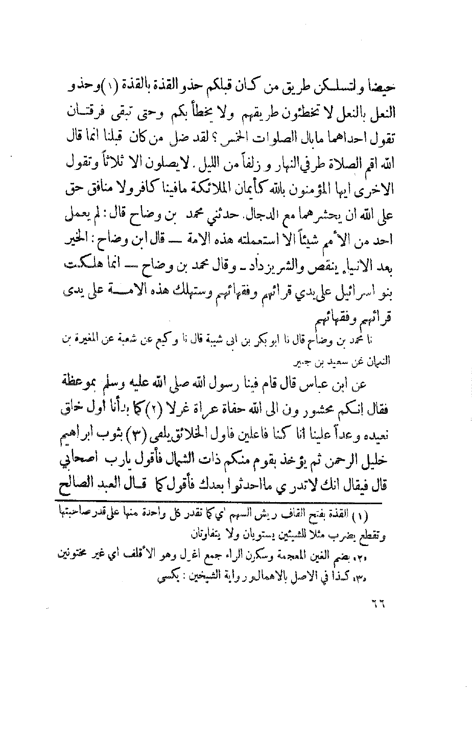 حيضاً ولتسلكن طريق من كان قبلكم حذو القذة بالقذة وحذو النعل بالنعل لا تخطئون طريقهم ولا يخطأ بكم وحتى تبقى فرقتان تقول أحدهما ما بال الصلوات الخمس? لقد ضل من كان قبلنا إنما قال الله أقم الصلاة طرفي النهار وزلفاً من الليل. لا يصلون إلا ثلاثاً وتقول الأخرى أيها المؤمنون بالله كأيمان الملائكة ما فينا كافر ولا منافق حق على الله أن يحشرهما مع الدجال حدثني محمد بن وضاح قال: لم يعمل أحد من الأمم شيئاً إلا استعملته هذه الأمة، قال أبن وضاح: الخير بعد الأنبياء ينقص والشر يزداد - وقال محمد بن وضاح - إنما هلكت بنو إسرائيل على يدي قرائهم وفقهائهم وستهلك هذه الأمة على