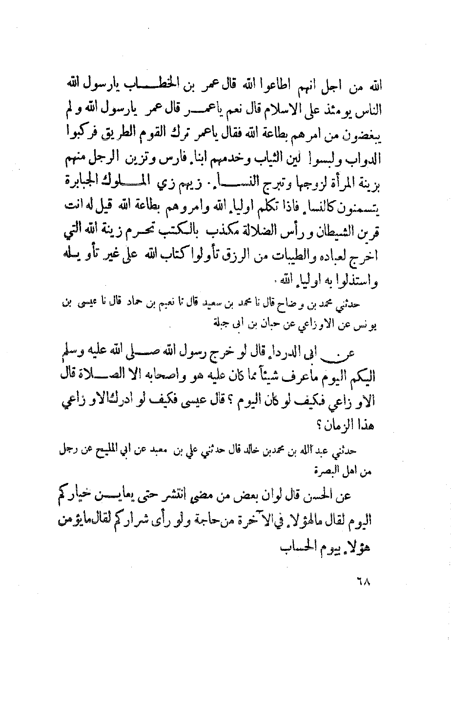 حدثني محمد بن وضاح قال نا محمد بن سعيد قال نا نعيم بن حماد قال نا عيسى بن يونس عن الاوزاعي عن حبان بن أبي جبلة عن أبي الدرداء قال لو خرج رسول الله صلى الله عليه وسلم إليكم اليوم ما عرف شيئاً مما كان عليه هو وأصحابه إلا الصلاة قال الاوزاعي فكيف لو كان اليوم? قال عيسى فكيف لو أدرك الاوزاعي هذا الزمان? حدثني عبد الله بن محمد بن خالد قال حدثني علي بن معبد عن أبي المليح عن رجل من أهل البصرة عن الحسن قال لو أن بعض من مضى أنتشر حتى يعاين خياركم اليوم لقال ما لهؤلاء في الآخرة من حاجة ولو رأى شراركم لقال ما يؤمن هؤلاء بيوم الحساب