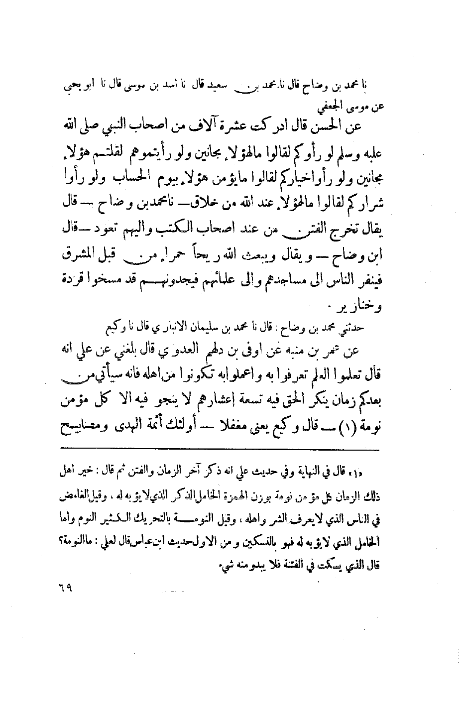 نا محمد بن وضاح قال نا محمد بن سعيد قال أسد بن موسى قال نا أبو يحيى عن موسى الجعفي عن الحسن قال أدركت عشرة آلاف من أصحاب النبي صلى الله عليه وسلم لو رأوكم لقالوا ما لهؤلاء مجانين ولو رأيتموهم لقلتم هؤلاء مجانين ولو رأو أخياركم لقالوا ما يؤمن هؤلاء بيوم الحساب ولو رأوا شراركم لقالوا ما لهؤلاء عند الله من خلاق- نا محمد بن وضاح- قال يقال تخرج الفتن من عند أصحاب الكتب وإليهم تعود- قال أبن وضاح- ويقال ويبعث الله ريحاً حمراء من قبل المشرق فينفر الناس إلى مساجدهم وإلى علمائهم فيجدونهم قد مسخوا قردة وخنازير.