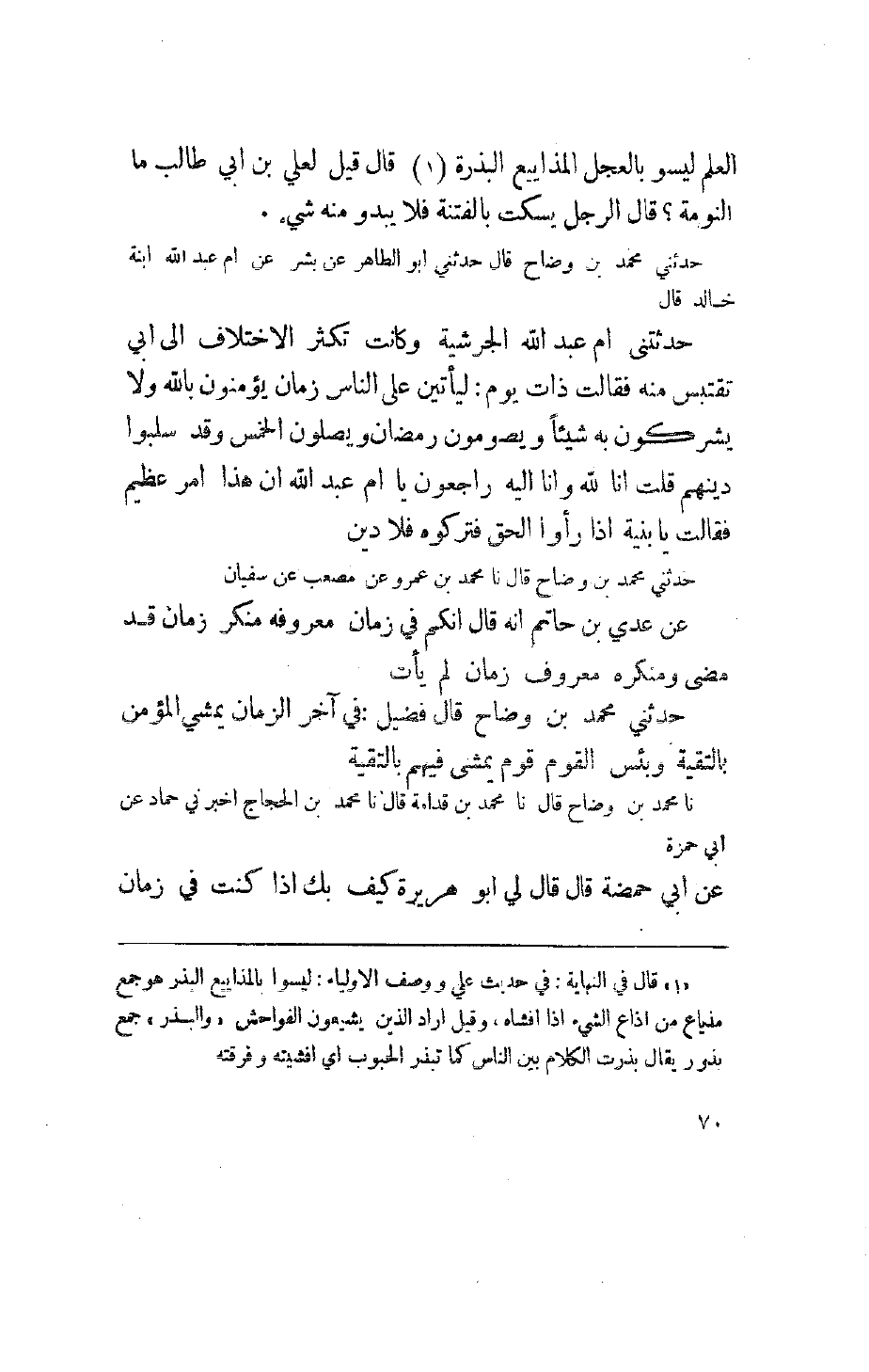 العلم ليسوا بالعجل المذاييع البذرة قال قيل لعلي بن أبي طالب ما النومة? قال الرجل يسكت بالفتنة فلا يبدو منه شيء.