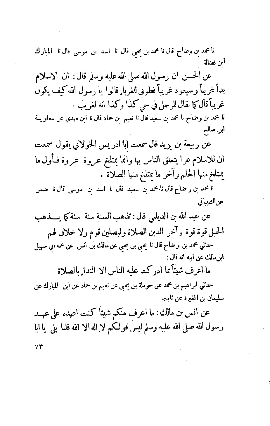 نا محمد بن وضاح قال نا محمد بن سعيد قال نا أسد بن موسى قال نا ضمر عن الشيباني عن عبد الله بن الدليمي قال: تذهب السُنة سَنة سَنة كما يذهب الحبل قوة قوة وآخر الدين الصلاة وليصلين قوم ولا خلاق لهم حدثني محمد بن وضاح قال نا يحيى عن مالك بن أنس عن عمه أبي سهيل أبن مالك عن أبيه أنه قال: ما أعرف شيئاً مما أدركت عليه الناس إلا النداء بالصلاة حدثني إبراهيم بن محمد عن حرملة بن يحيى عن نعيم بن حماد عن أبي المبارك عن سليمان بن المغيرة عن ثابت عن أنس بن مالك: ما أعرف منكم شيئاً كنت أعهده على عهد رسول الله صلى الله عليه وسلم ليس قولكم لا اله إلا الله قلنا بلى يا أبا