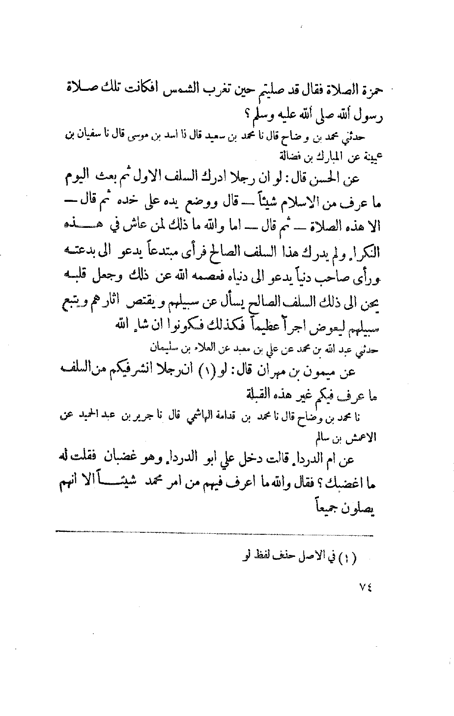 حمزة الصلاة فقال فقد صليتم حين تغرب الشمس أفكانت تلك صلاة رسول الله صلى الله عليه وسلم? حدثني محمد بن وضاح قال نا محمد بن سعيد قال نا أسد بن موسى قال نا سفيان بن عيينة عن المبارك بن فضالة عن الحسن قال: لو أن رجلاً أدرك السلف الأول ثم بعث اليوم ما عرف من الإسلام شيئاً- قال ووضع يده على خده ثم قال- إلا هذه الصلاة- ثم قال- أما والله ما ذلك لمن عاش في هذه النكراء ولم يدرك هذا السلف الصالح فرأى مبتدعاً يدعو إلى بدعته ورأى صاحب دنيا يدعو إلى دنياه فعصمه الله عن ذلك وجعل قلبه يحن إلى ذلك السلف الصالح يسأل عن سبيلهم ويقتص آثارهم ويتبع سبيلهم ليعوض أجراً عظيماً فكذلك فكونوا أن شاء الله حدثني عبد الله بن محمد عن علي بن معبد عن العلاء بن سليمان عن ميمون بن مهران قال: لو أن رجلاً أنتشر فيكم من السلف ما عرف فيكم غير هذه القبلة نا محمد بن وضاح قال نا محمد بن قدامة الهاشمي قال نا جرير بن عبد الحميد عن الأعمش بن سالم عن أم الدرداء قالت دخل علي أبو الدرداء وهو غضبان فقلت له ما أغضبك? فقال والله ما أعرف فيهم من أمر محمد شيئاً إلا إنهم يصلون جميعاً