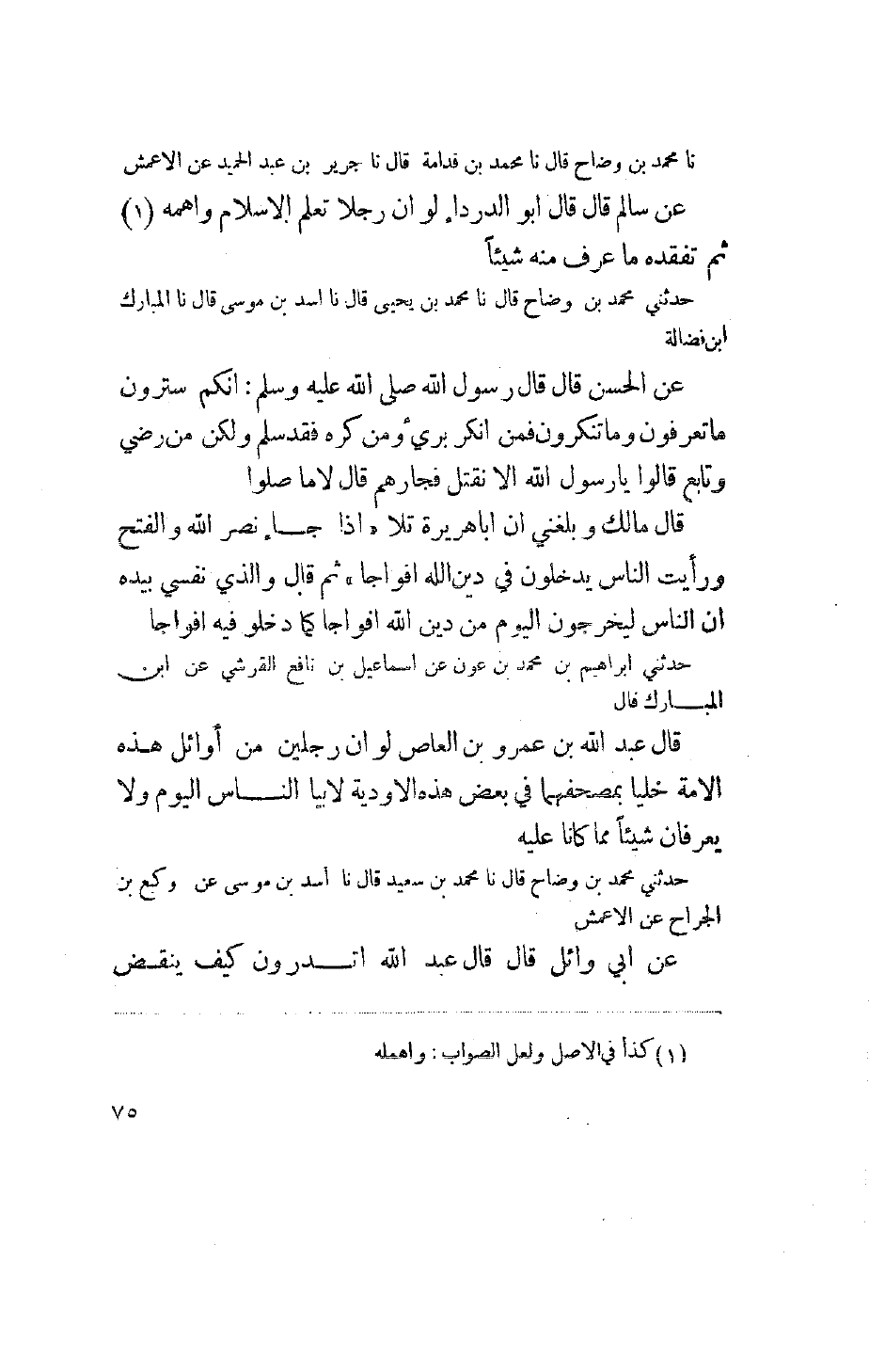 الدرداء لو أن رجلاً تعلم الإسلام وأهمه ثم تفقده ما عرف منه شيئاً حدثني محمد بن وضاح قال نا محمد بن يحيى قال نا أسد بن موسى قال نا المبارك أبن فضالة عن الحسن قال قال رسول الله صلى الله عليه وسلم: إنكم سترون ما تعرفون وما تنكرون فمن أنكر برئ ومن كره فقد سلم ولكن من رضي وتابع قالوا يا رسول الله ألا نقتل فجارهم قال لا ما صلوا قال مالك وبلغني أن أبا هريرة تلا) إذا جاءَ نَصرُ اللهِ والفَتحُ ورأيتَ الناسَ يدخلونَ في دينِ اللهِ أفواجا (ثم قال والذي نفسي بيده أن الناس ليخرجوا اليوم من دين الله أفواجا كما دخلوا فيه أفواجا حدثني إبراهيم بن محمد بن عون عن إسماعيل بن نافع القرشي عن أبن المبارك قال قال عبد بن عمرو بن العاص لو إن رجلين من أوائل هذه الأمة خليا بمصحفهما في بعض هذه الأودية لأبيا الناس اليوم ولا يعرفان شيئاً مما كانا عليه حدثني محمد بن وضاح قال نا محمد بن سعيد قال نا أسد بن موسى عن وكيع بن الجراح عن الأعمش عن أبي وائل قال قال عبد الله أتدرون كيف ينقض