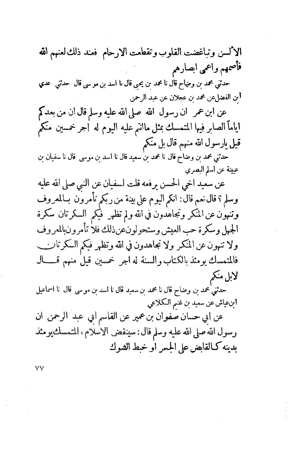 الألسن وتباغضت القلوب وتقطعت الأرحام فعند ذلك لعنهم الله فأصمهم وأعمى أبصارهم حدثني محمد بن وضاح قال نا محمد بن يحيى قال نا أسد بن موسى قال حدثني عدي أبن الفضل عن محمد بن عجلان عن عبد الرحمن عن أبن عمر أن رسول الله صلى عليه وسلم قال إن من بعدكم أياماً الصابر فيها المتمسك بمثل ما أنتم عليه اليوم له أجر خمسين منكم قيل يا رسول الله منهم قال بل منكم حدثني محمد بن وضاح قال نا محمد بن سعيد قال نا أسد بن موسى قال نا سفيان بن عيينة عن أسلم البصري عن سعيد أخي الحسن يرفعه قلت لسفيان عن النبي صلى الله عليه وسلم? قال نعم قال: أنكم اليوم على بينة من ربكم تأمرون بالمعروف وتنهون عن المنكر وتجاهدون في الله ولم تظهر فيكم السكرتان سكرة الجهل وسكرة حب العيش وستحولون عن ذلك فلا تأمرون بالمعروف ولا تنهون عن المنكر ولا تجاهدون في الله وتظهر فيكم السكرتان فالمتمسك يومئذ بالكتاب والسُنة له أجر خمسين قيل منهم قال لا بل منكم حدثني محمد بن وضاح قال نا محمد بن سعيد قال نا أسد بن موسى قال نا إسماعيل أبن عياش عن سعيد بن غنيم الكلاعي عن أبي حسان صفوان بن عمير عن القاسم أبي عبد الرحمن إن رسول الله صلى الله عليه وسلم قال: سينقض الإسلام، المتمسك يومئذ بدينه كالقابض على الجمر أو خبط الشوك