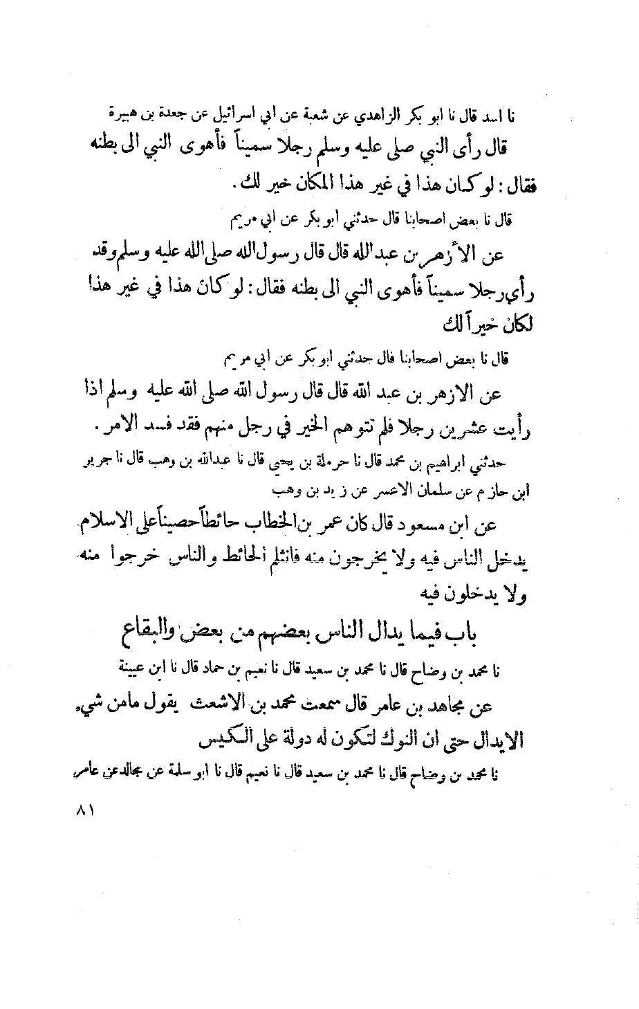 قال نا بعض أصحابنا قال حدثني أبو بكر عن أبي مريم عن الأزهر بن عبد الله قال قال رسول الله صلى الله عليه وسلم وقد رأى رجلاً سميناً فأهوى النبي إلى بطنه فقال: لو كان هذا في غير هذا لكان خيراً لك قال نا بعض أصحابنا قال حدثني أبو بكر عن أبي مريم عن الأزهر بن عبد الله قال قال رسول الله صلى الله عليه وسلم إذا رأيت عشرين رجلاً فلم تتوهم الخير في رجل منهم فقد فسد الأمر.